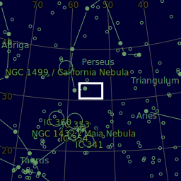 NGC 1333 is a reflection nebula located in the northern constellation Perseus, positioned next to the southern constellation border with Taurus and Aries. It was first discovered by German astronomer Eduard Schönfeld in 1855. The nebula is visible as a hazy patch in a small telescope, while a larger aperture will show a pair of dark nebulae designated Barnard 1 and Barnard 2. It is in the western part of the Perseus molecular cloud and is a young region of very active star formation.