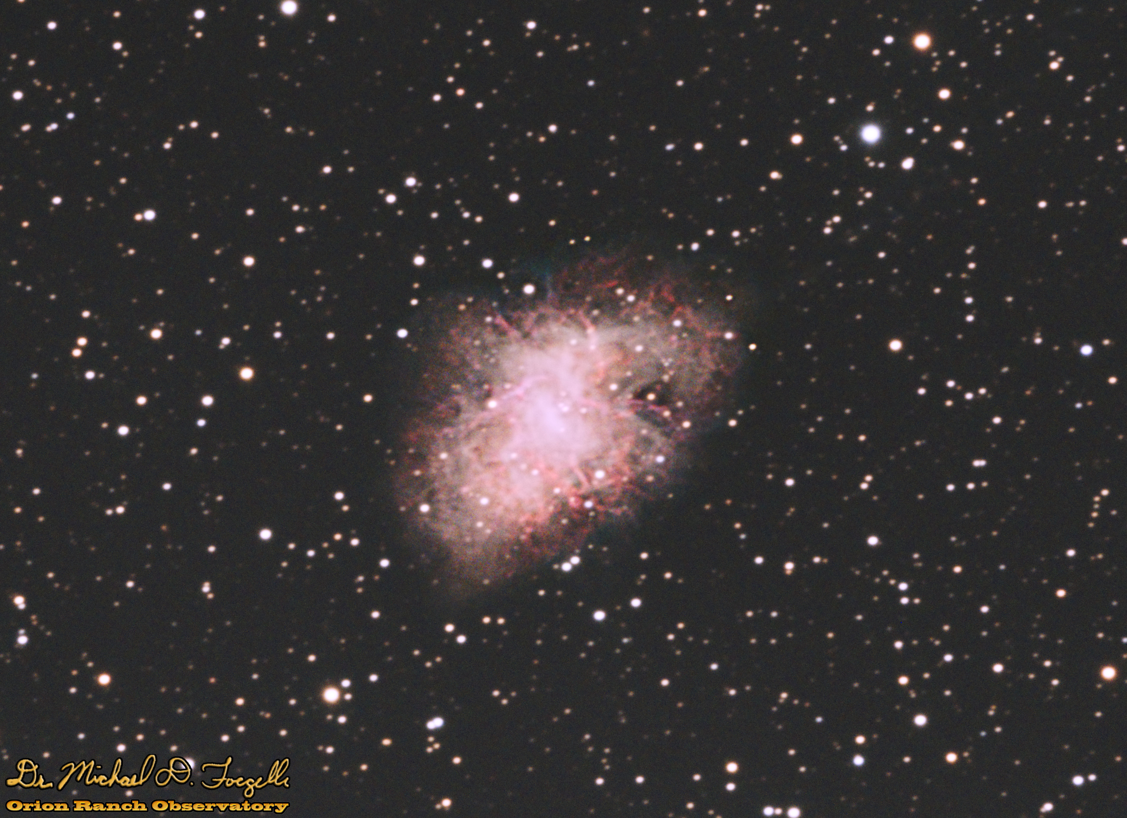 The Crab Nebula (M1 or NGC 1952) is a supernova remnant and pulsar wind nebula in the constellation of Taurus. The nebula is the remnant of a bright supernova recorded by Chinese astronomers in 1054 A.D. that was visible during the daytime. The nebula lies in the Perseus Arm of the Milky Way galaxy, at a distance of about 6,500 light years from Earth. It has a diameter of 11 light years, corresponding to an apparent diameter of about 7 arcminutes as seen from Earth, and is expanding at a rate of about 1,500 kilometers per second (930 mi/s), or 0.5% of the speed of light. At an apparent magnitude of 8.4, it is not visible to the naked eye but can be detected with a good telescope under reasonably dark skies.