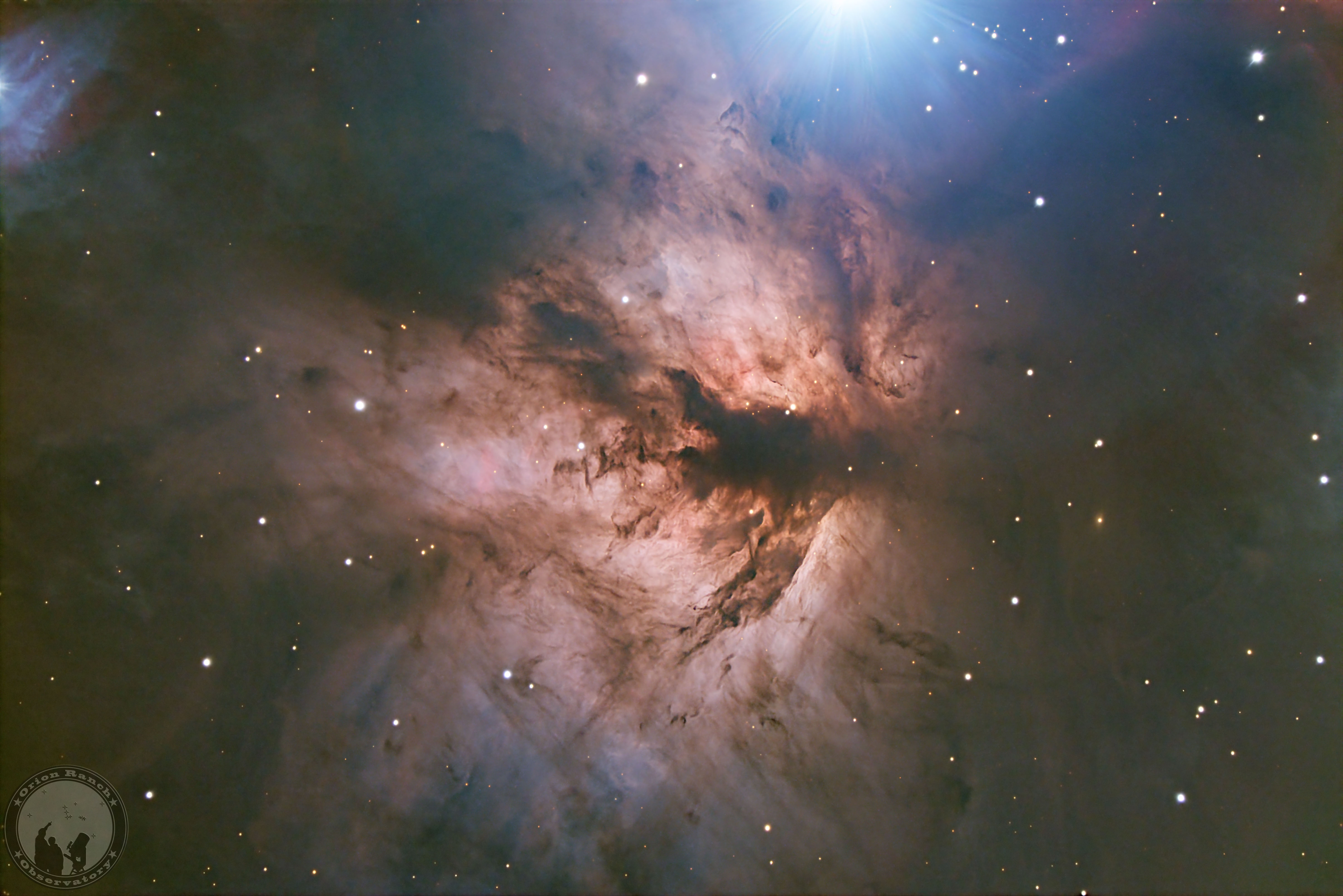 The Flame Nebula (NGC 2024 or Sh2-277) is an orange colored emission nebula in the constellation Orion near the Horsehead Nebula and just off the belt of Orion. It is about 1350 light-years away. Alnitak, the eastern most star in the Belt of Orion, provides the bright blue flare in the top of this image. With a large aperture telescope at moderate magnification, the Flame Nebula is just barely visible in very dark skies.