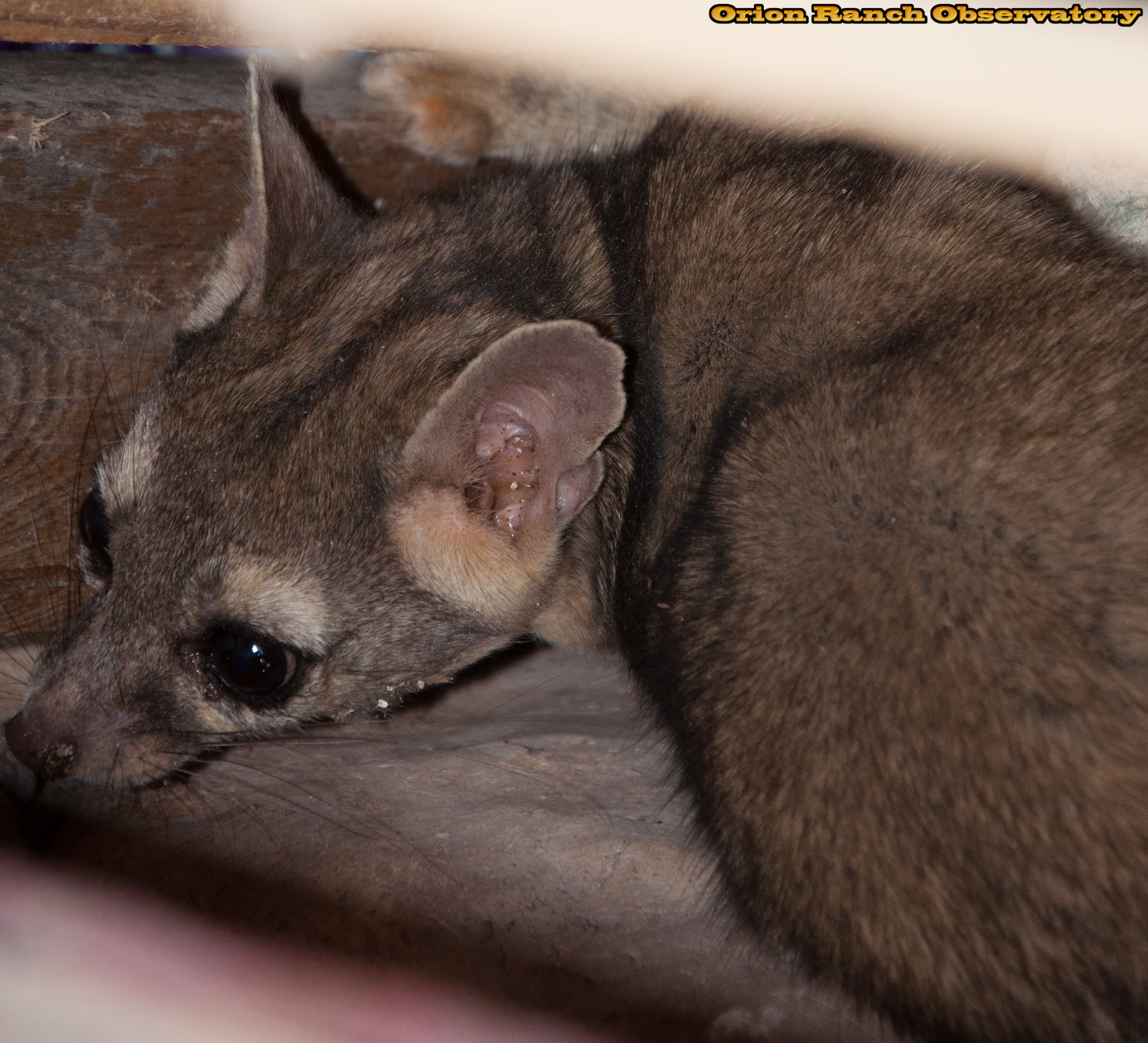 After hearing a bunch of rustling and wierd growling noises that obviously weren't from a rat, coming from behind a partial wall panel in the old house, I got my first view of an unhappy ringtail. This was taken in October of 2011, and as you'll see based on later photos, this was apparently a female.