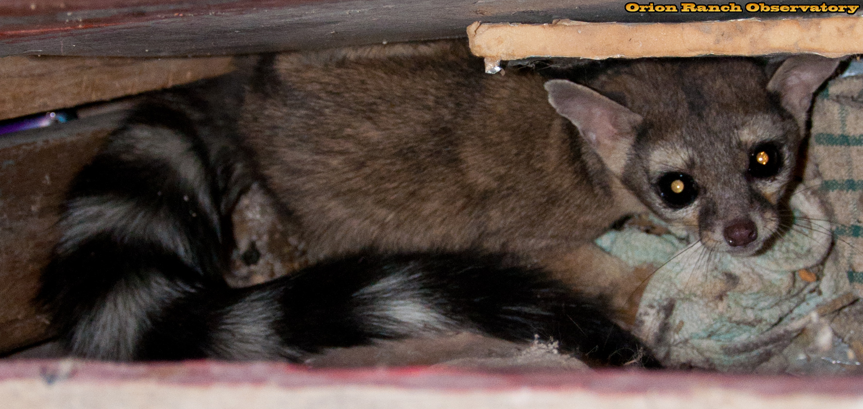 After hearing a bunch of rustling and wierd growling noises that obviously weren't from a rat, coming from behind a partial wall panel in the old house, I got my first view of an unhappy ringtail. This was taken in October of 2011, and as you'll see based on later photos, this was apparently a female.