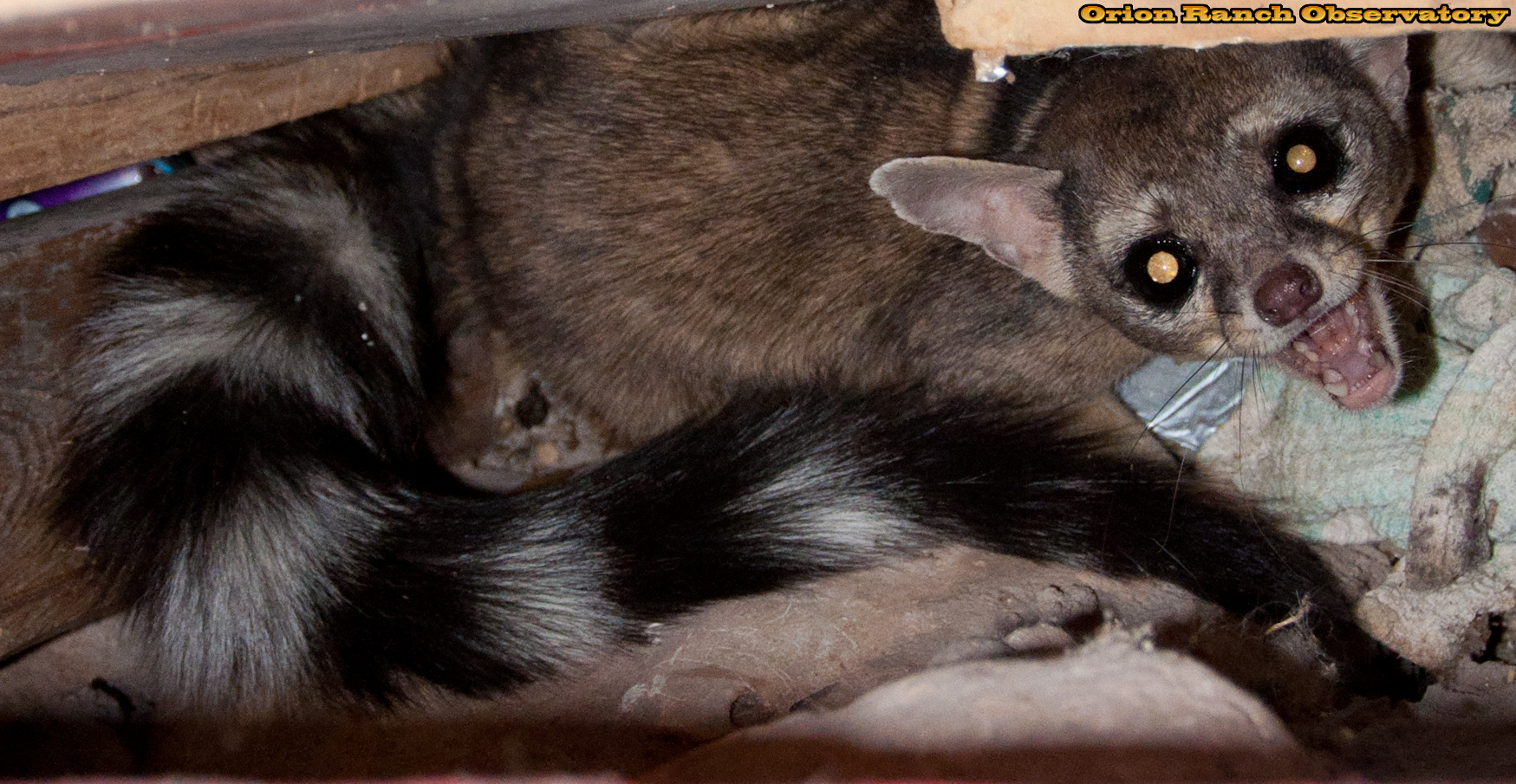 After hearing a bunch of rustling and wierd growling noises that obviously weren't from a rat, coming from behind a partial wall panel in the old house, I got my first view of an unhappy ringtail. This was taken in October of 2011, and as you'll see based on later photos, this was apparently a female.
