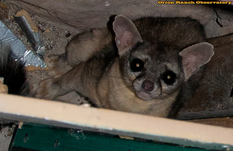 After hearing a bunch of rustling and wierd growling noises that obviously weren't from a rat, coming from behind a partial wall panel in the old house, I got my first view of an unhappy ringtail. This was taken in October of 2011, and as you'll see based on later photos, this was apparently a female.