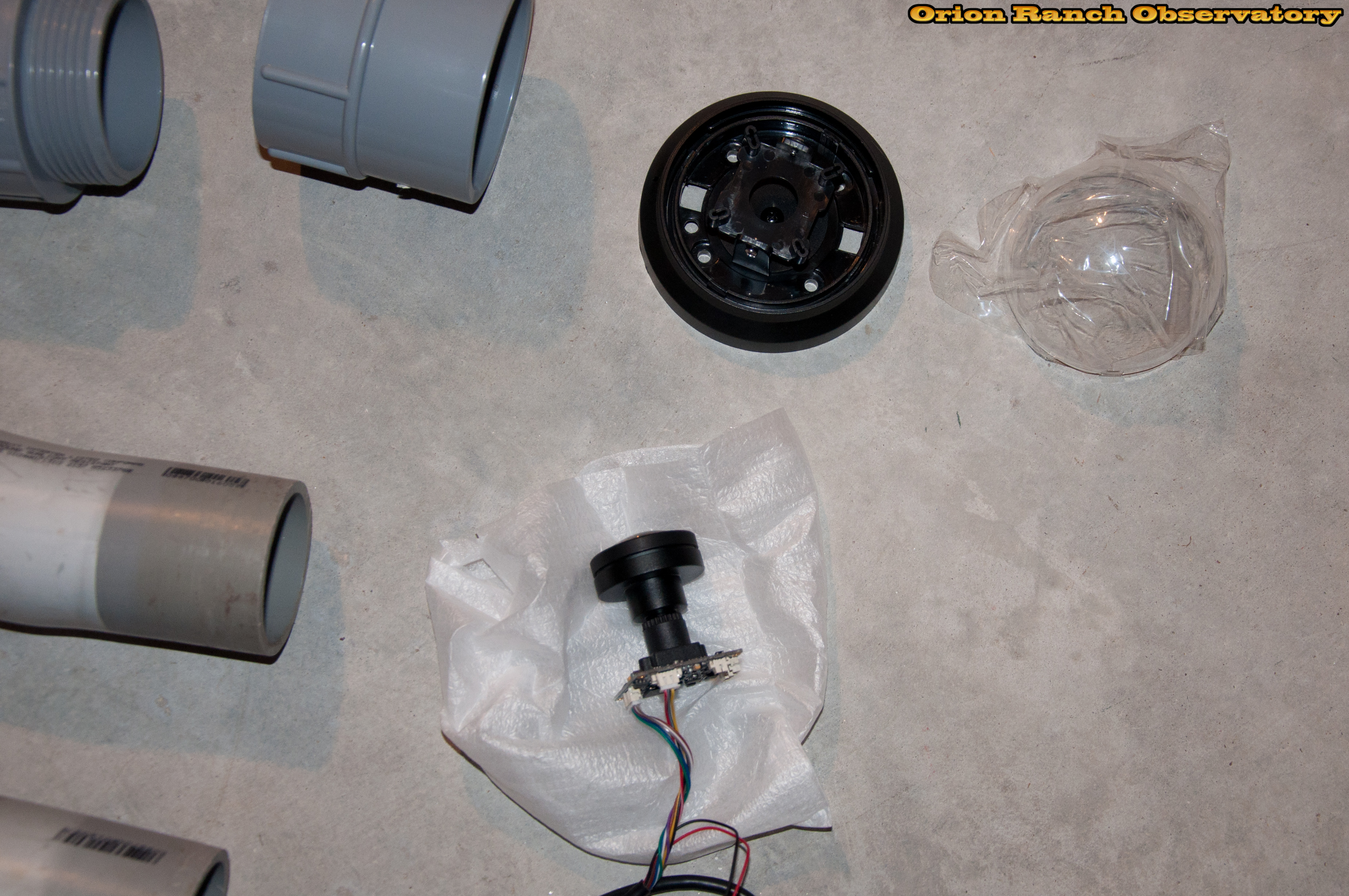 Closeup of the low lux camera and wide angle lens, as well as the compact dome and camera mount, which is too small for the lens as-is.