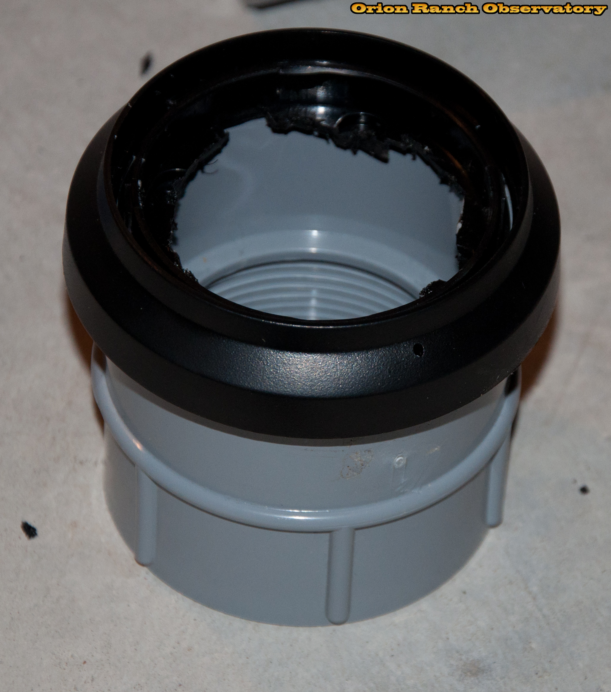 Gluing the modified dome base to a 2" PVC screw coupling to make a removable cap for the camera mount.