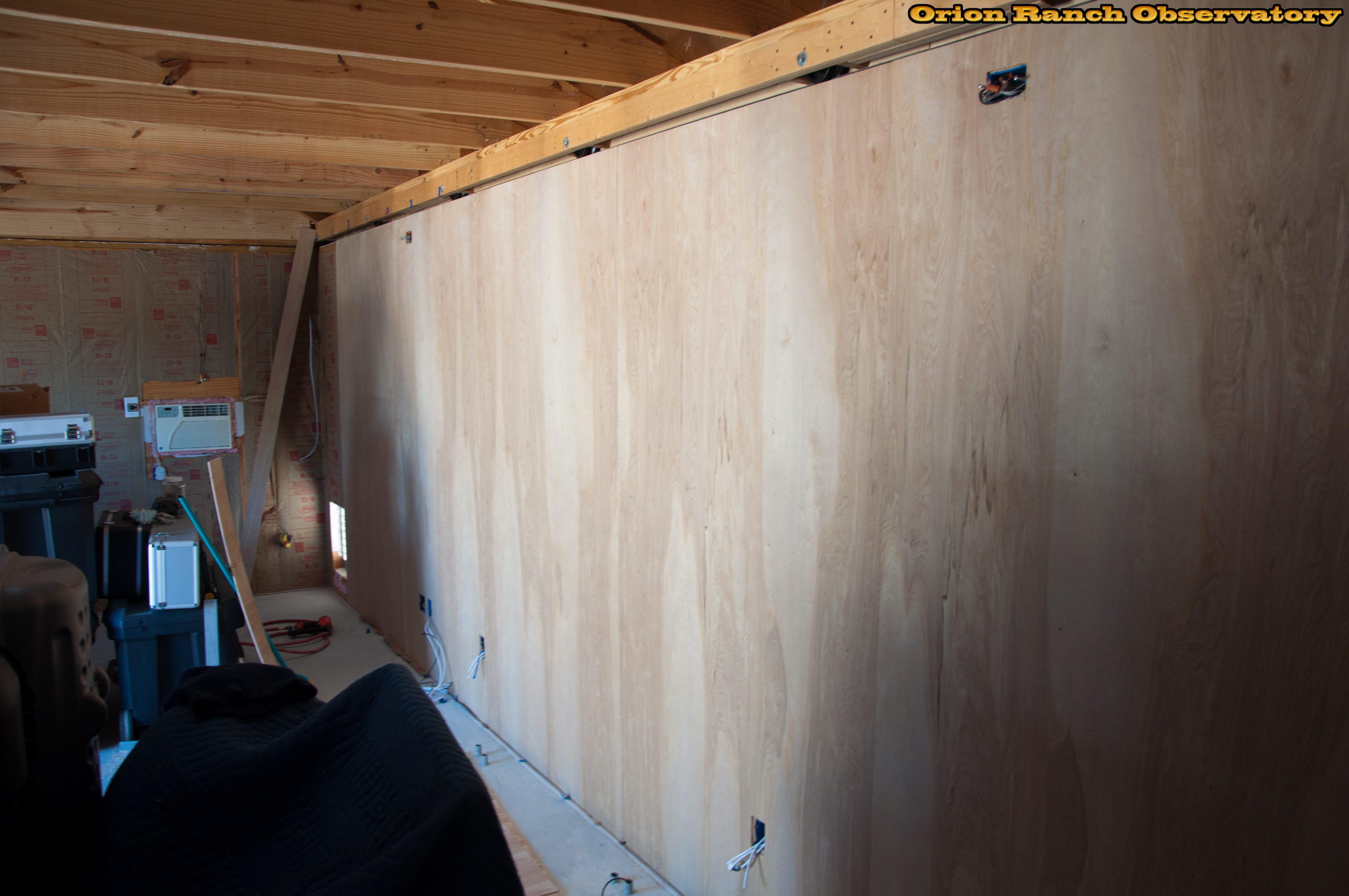 First (west) wall nearly done. All but one narrow piece that will require ripping a sheet in half.