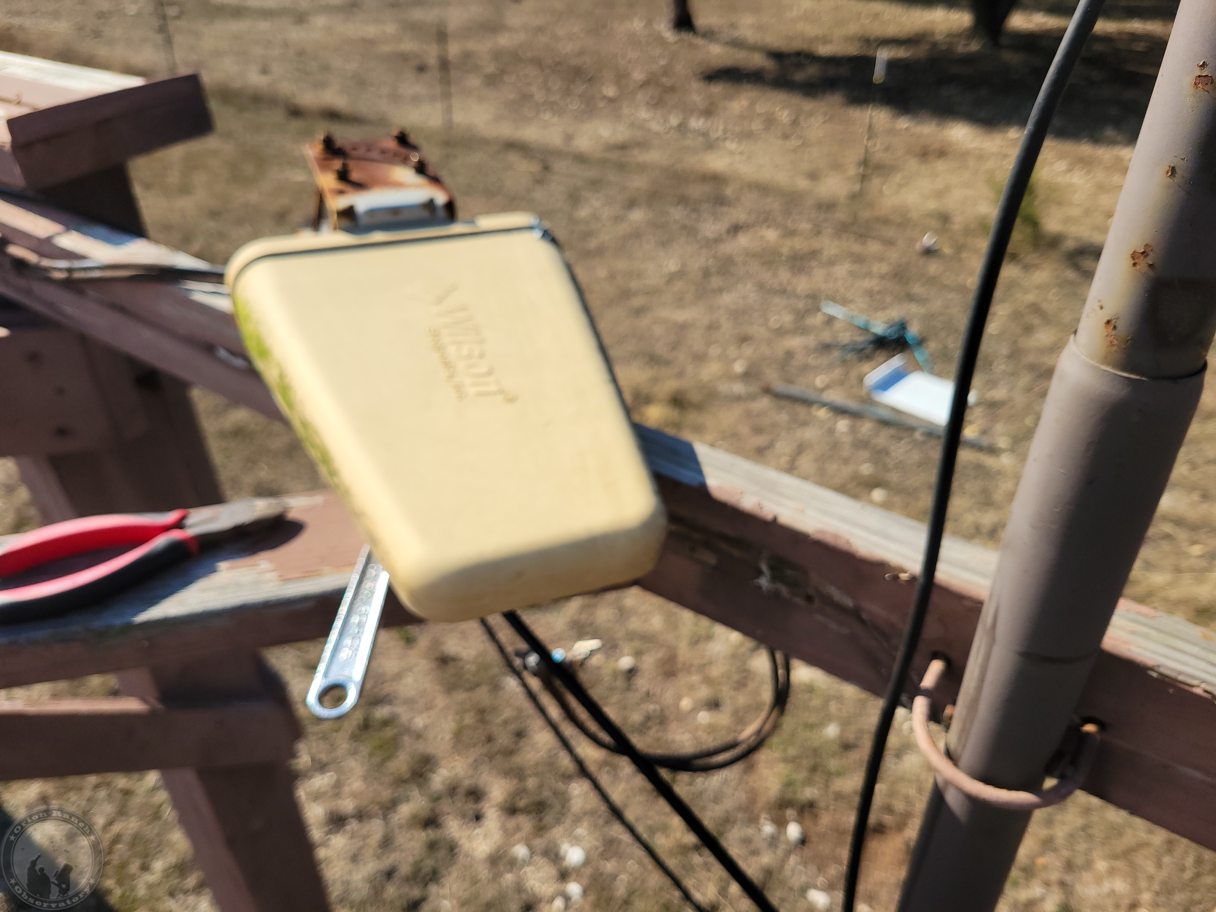Disconnecting the cables for the TV antenna and cell phone booster antennas. The center pin for the TV antenna was burned off at the lightning arrestor. May have been struck or may have been problems with the power supply that fed the amplifier in the antenna. I probably won't put the antennas back, but the post makes for a good lightning rod. Not to mention the antenna was always my North indicator in my all-sky camera!