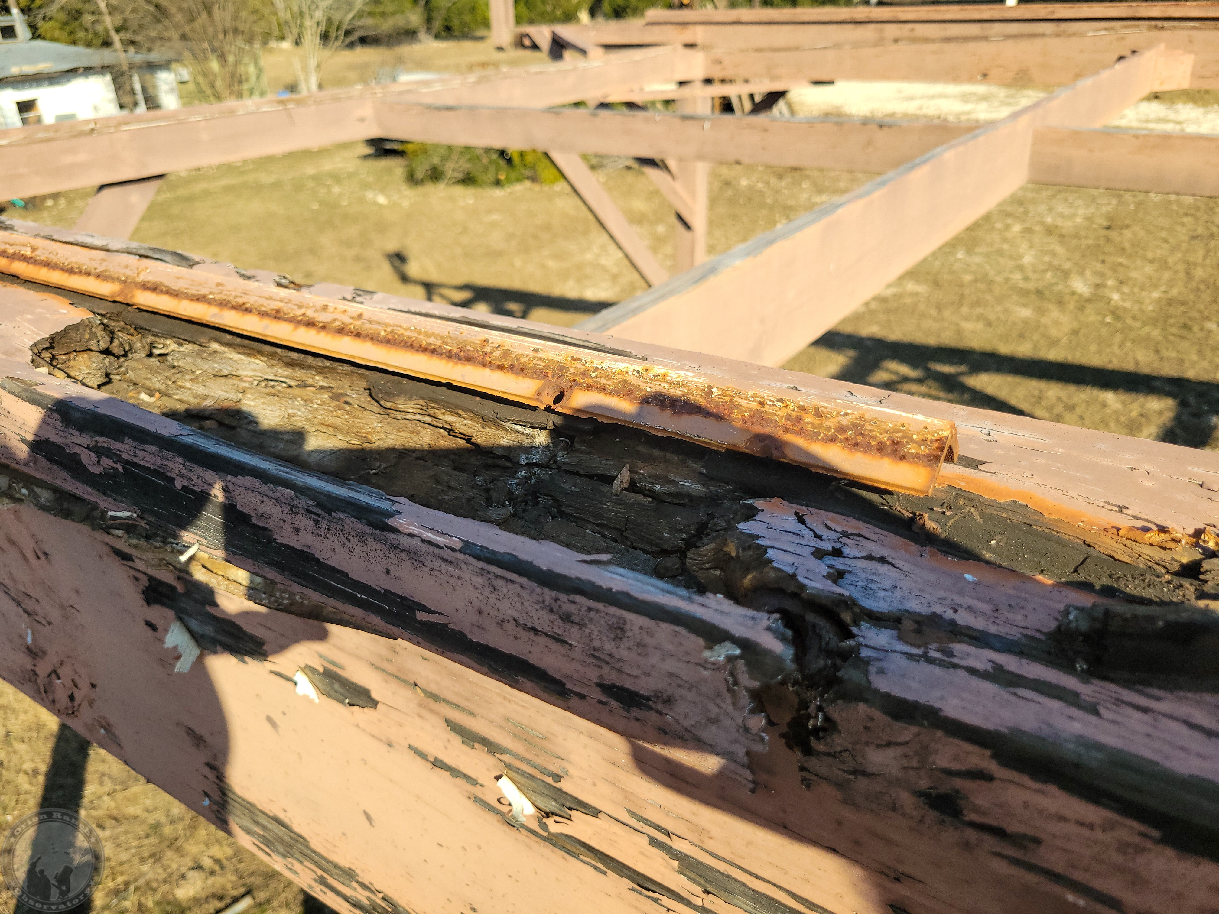 Removing all of the angle iron from the rails. Most of the rot is directly under the angle where it would hold the water. Overall, only the cap rail is damaged. The underlying beams are still in really good shape. This rot area actually looks blackened almost like it's burned on the surface. Lightning?