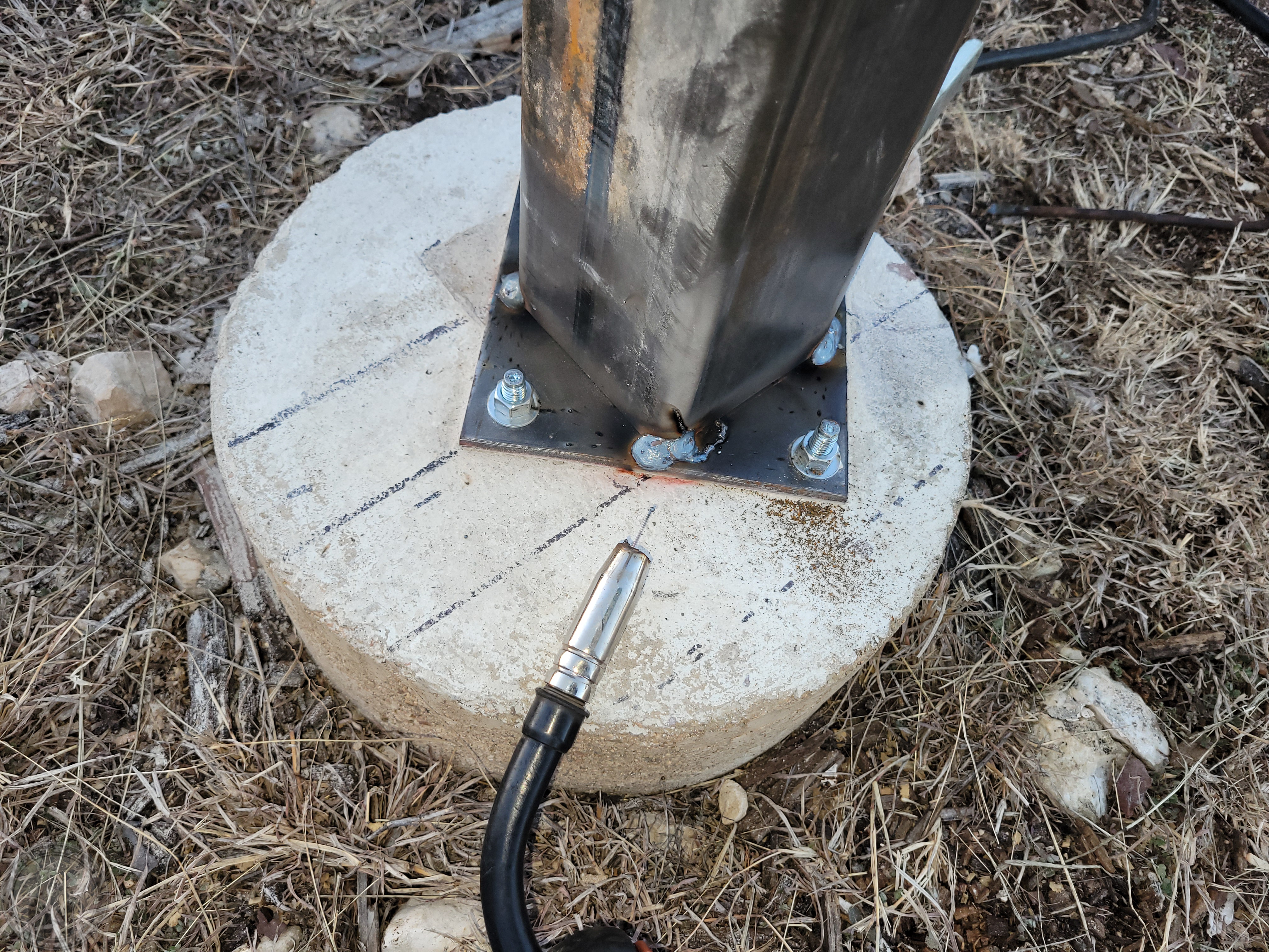 Tacking the corners of the last post after lining everything up. These are quite solid with just these welds. I'll finish the full welds after I get the tops capped (i.e. after the rails are in place). For one thing, I don't want to risk rain water pooling in the bottom of the post, although it should still drain out through the center hole.