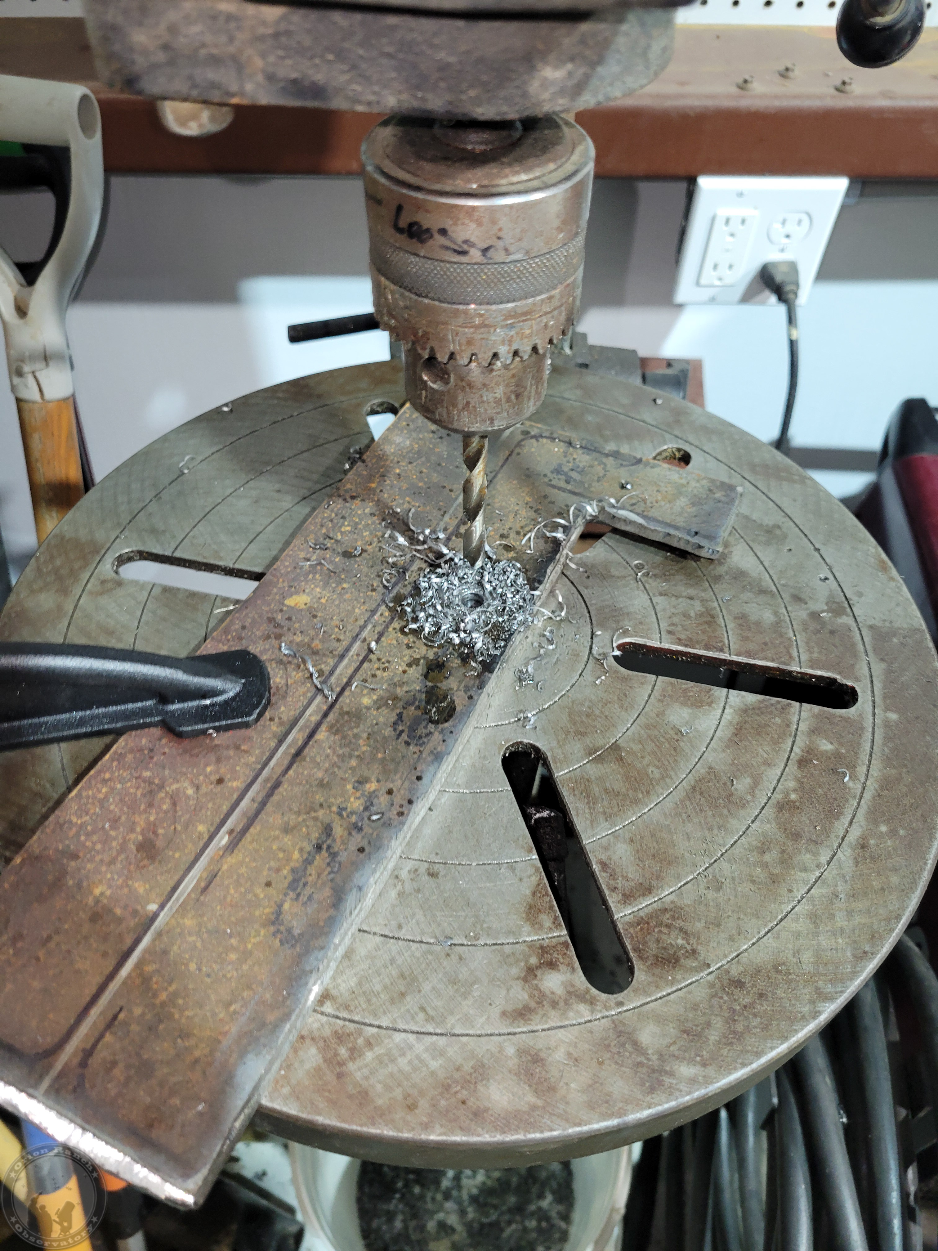 Adding 5/16" holes to the plates for using lag bolts to pull the rail tight to the observatory wall frame. This shouldn't be going anywhere after installation! At least not without taking part of the observatory with it.