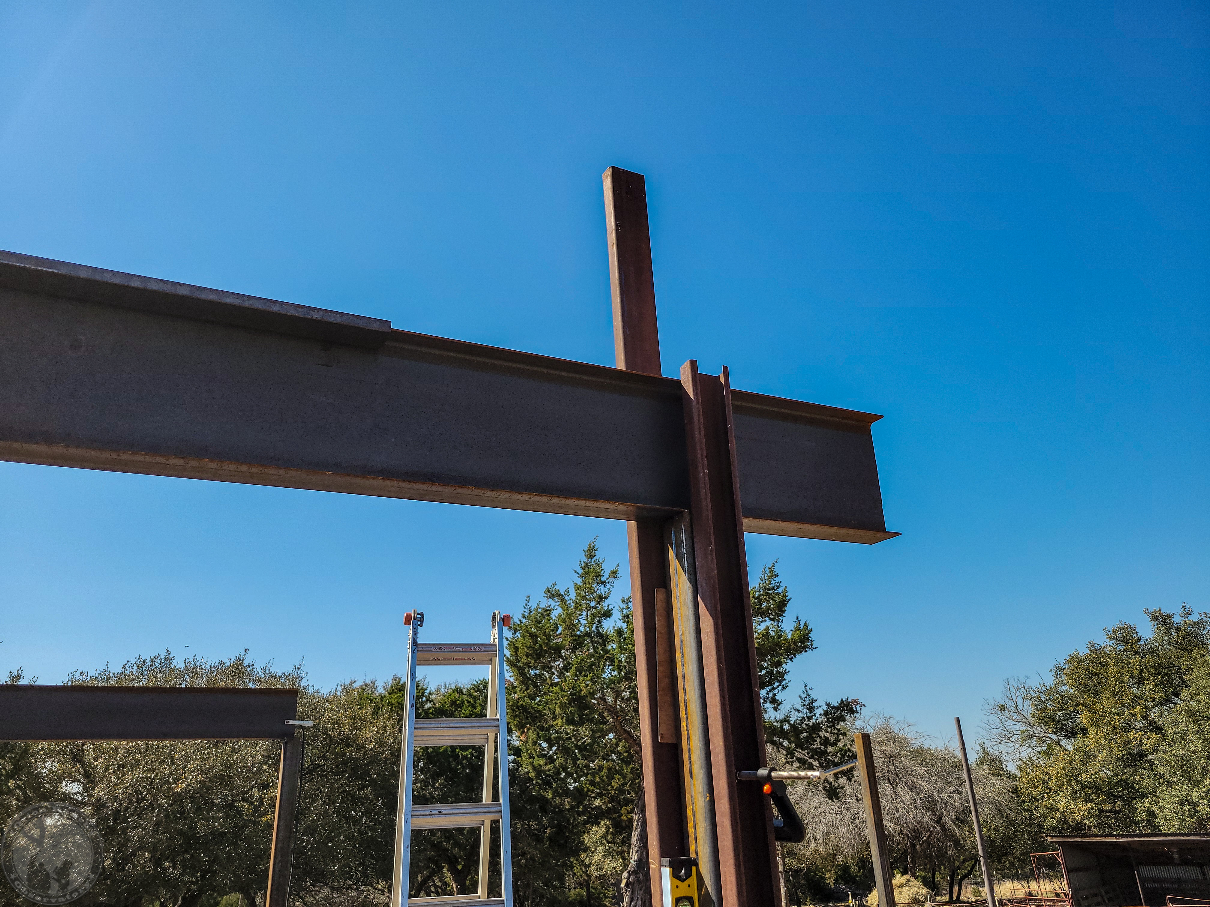 Did this a bit differently, with the one long piece of C channel to block the rail from coming back towards me and the outside piece removed. I then used the outside piece and C clamp to gradually stand the beam up on the post so it couldn't go anywhere. Much better! Only real problem in this orientation was that the purlin on the forks was hanging out too far to the left (observatory) side, making it really hard to lift and maneuver that end into place.