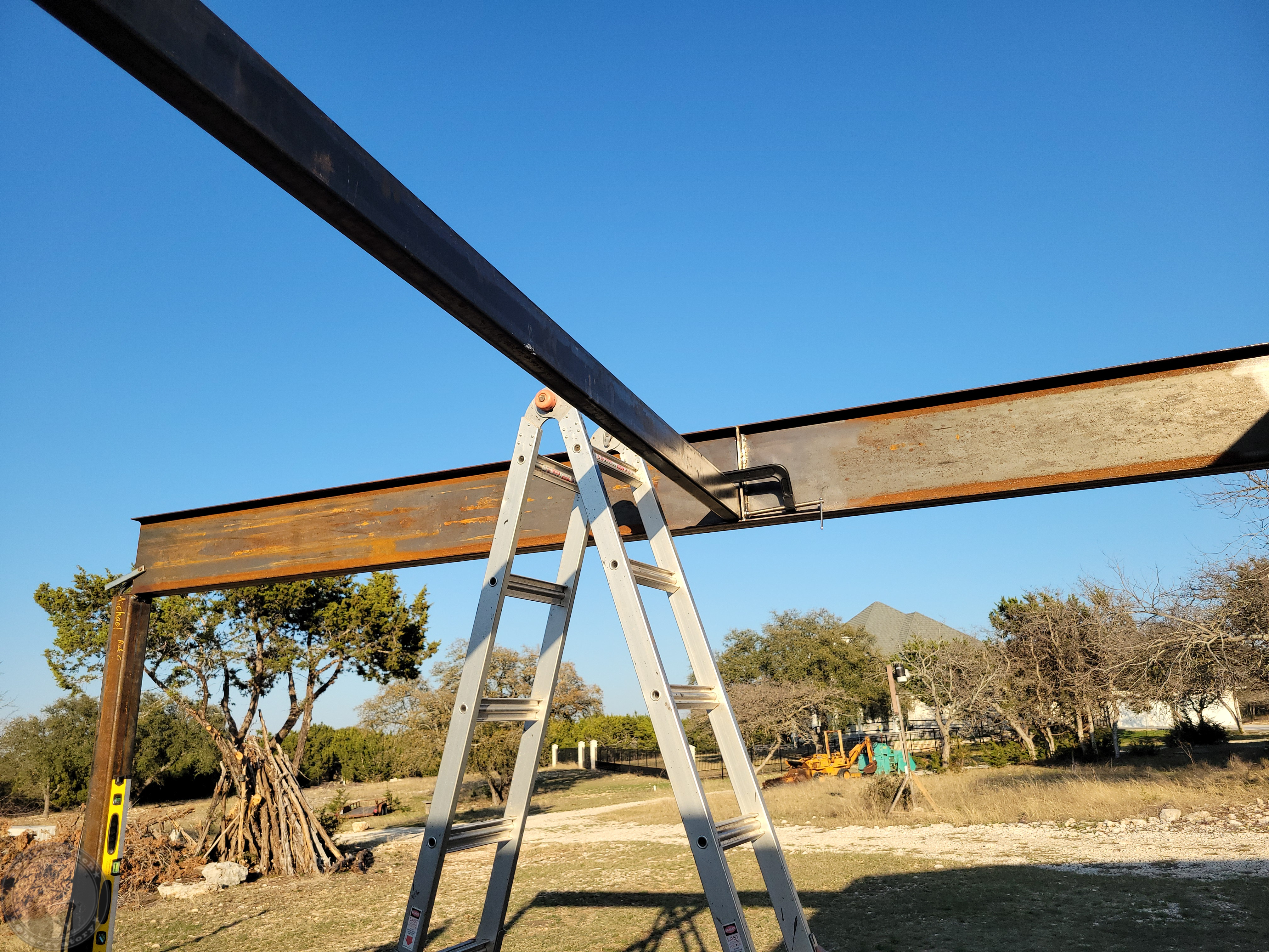 Clamping the first cross member into place. I'd originally cut two pieces at 188.5" ( the rail center-to-center), so I needed to trim a quarter inch off for the rail web anyway, as well as chamfering edges to clear welds and the curved inside edge of the rail, but when I went back and measured those rails, they were about 3/32 too long! Presumably, that's the thermal expansion/contraction I'll have to deal with between the cold day I was originally working with an the 80 degree day when I did this.