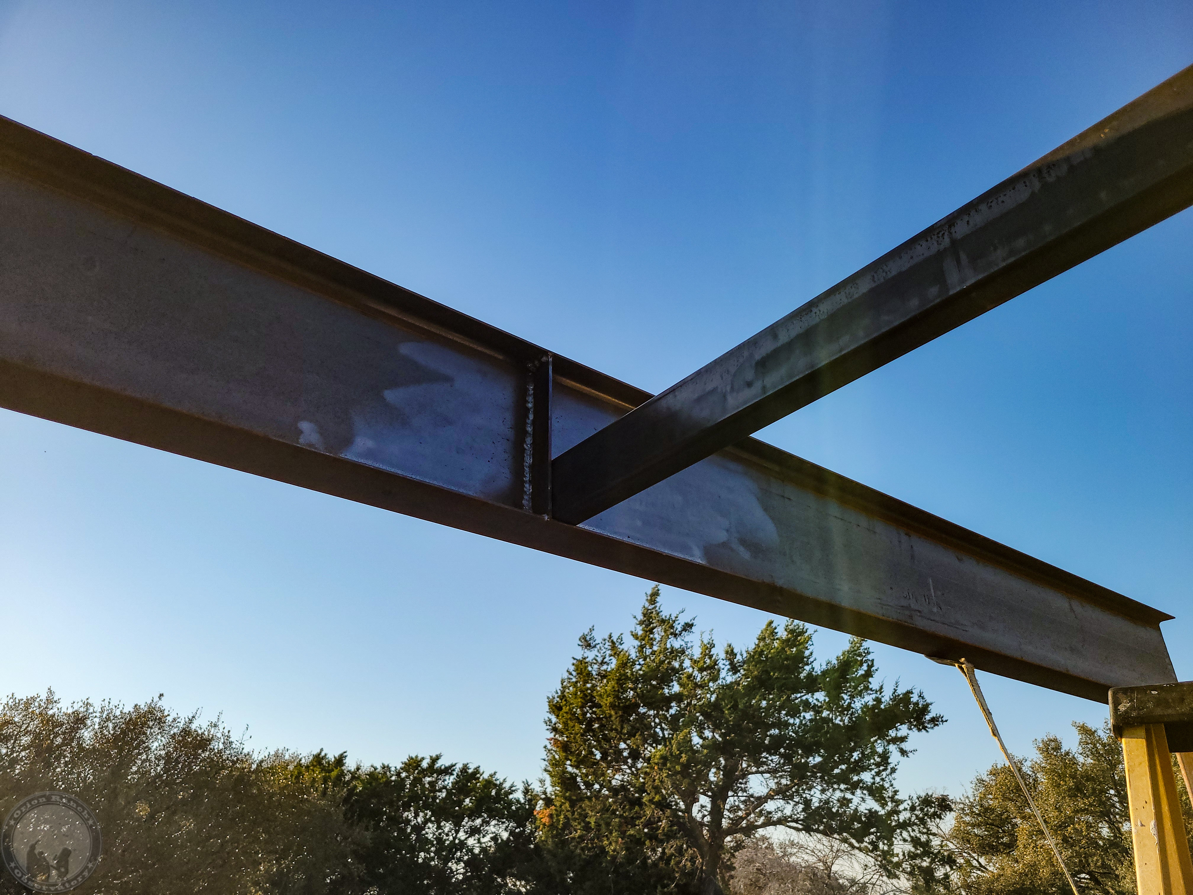 Clamping the first cross member into place. I'd originally cut two pieces at 188.5" ( the rail center-to-center), so I needed to trim a quarter inch off for the rail web anyway, as well as chamfering edges to clear welds and the curved inside edge of the rail, but when I went back and measured those rails, they were about 3/32 too long! Presumably, that's the thermal expansion/contraction I'll have to deal with between the cold day I was originally working with an the 80 degree day when I did this.