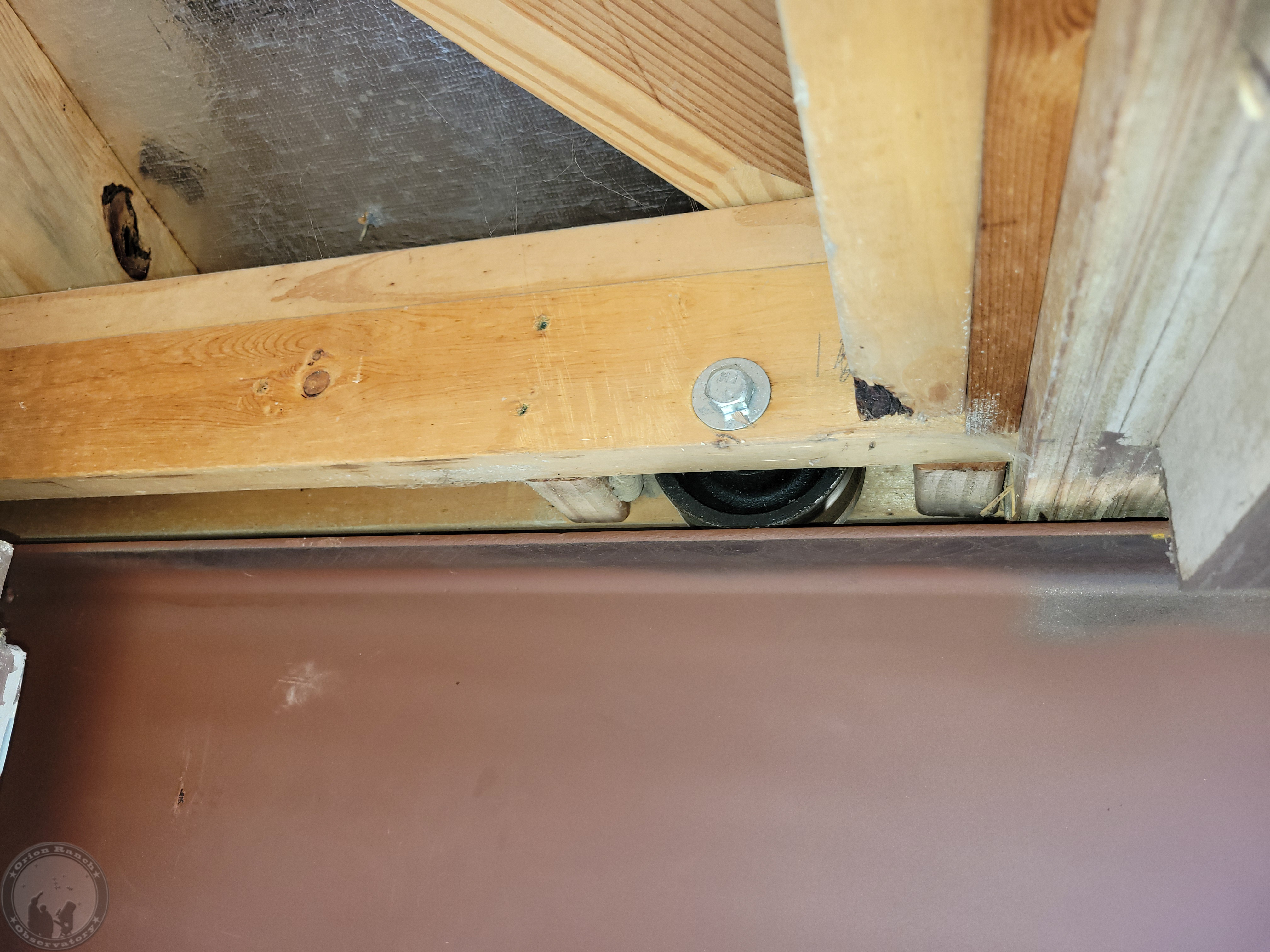 I tried multiple attempts to align a laser along the side of the rail inside the observatory and shoot it out past the roof, but none of my lasers were designed to sit right and placement was way too finicky. So instead, I went back to trying to boresight off of the angle iron rails using a boresight laser. That was finicky too, since any bit of rust in the tube would be enough to set it off, but this laser let me make three-point contact in the front and two points in the back to get it to settle straight. The west rail still had a problem because the angle was up off of the metal, so I rolled the roof off a foot and a half to push it down. Then the spot ended up right on center, but you can see the black dot near my sleeve cuff where it was pointing originally. I'm pretty happy with this alignment sitting right in the middle of the rail!