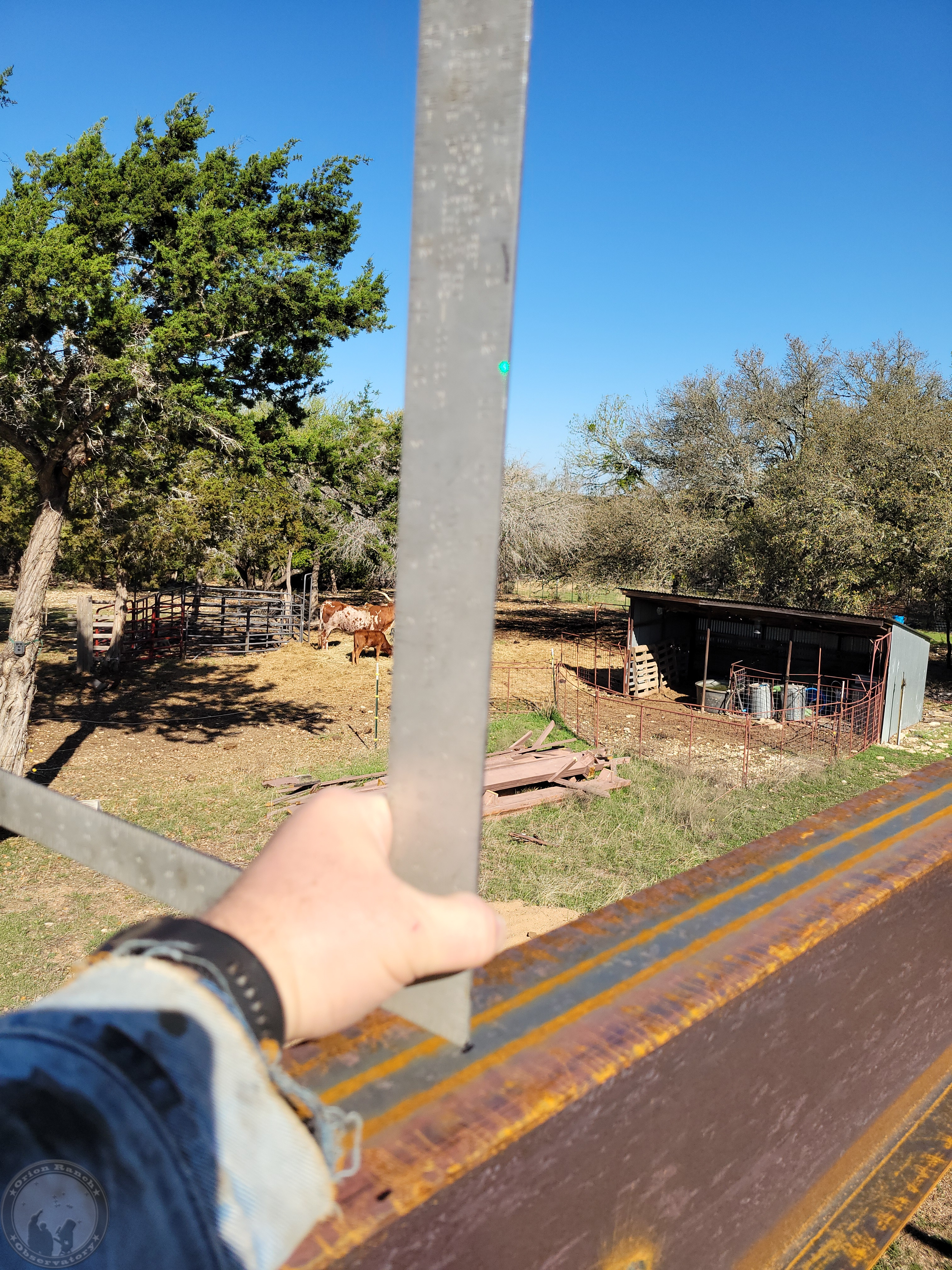 I tried multiple attempts to align a laser along the side of the rail inside the observatory and shoot it out past the roof, but none of my lasers were designed to sit right and placement was way too finicky. So instead, I went back to trying to boresight off of the angle iron rails using a boresight laser. That was finicky too, since any bit of rust in the tube would be enough to set it off, but this laser let me make three-point contact in the front and two points in the back to get it to settle straight. The west rail still had a problem because the angle was up off of the metal, so I rolled the roof off a foot and a half to push it down. Then the spot ended up right on center, but you can see the black dot near my sleeve cuff where it was pointing originally. I'm pretty happy with this alignment sitting right in the middle of the rail!