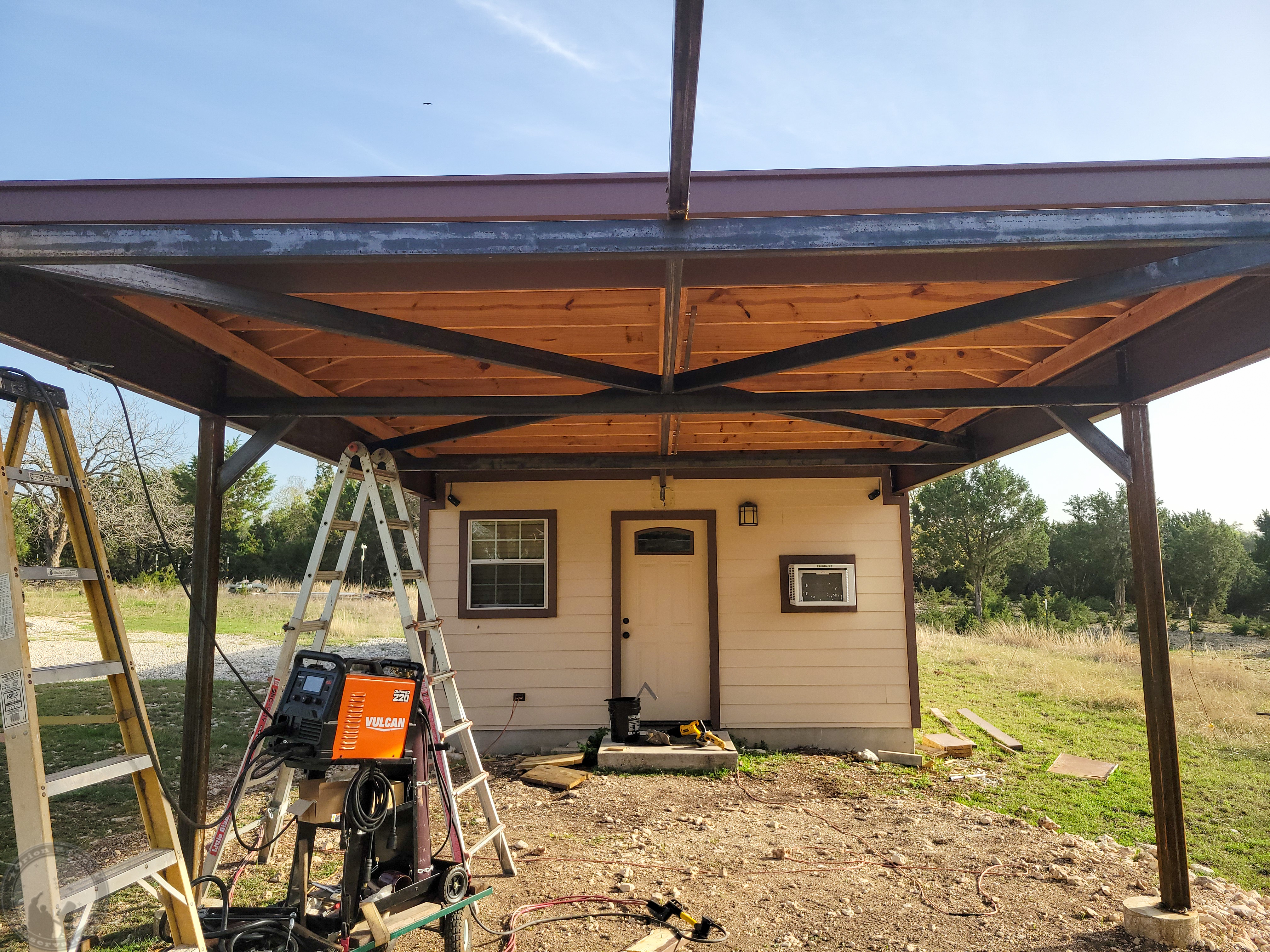 After buffing most of the paint and rust off of the old angle iron, I tacked the end and rolled the roof off, tacking as I went. The result ended up a bit wavy, so I'll probably cut a few of those welds and tweak, but the roof moves VERY smoothly! We were getting 30 MPH wind gusts and this never noticed (can't say the same for the inside of the observatory!). A far cry from when I first put up the rails and they would vibrate in the wind!