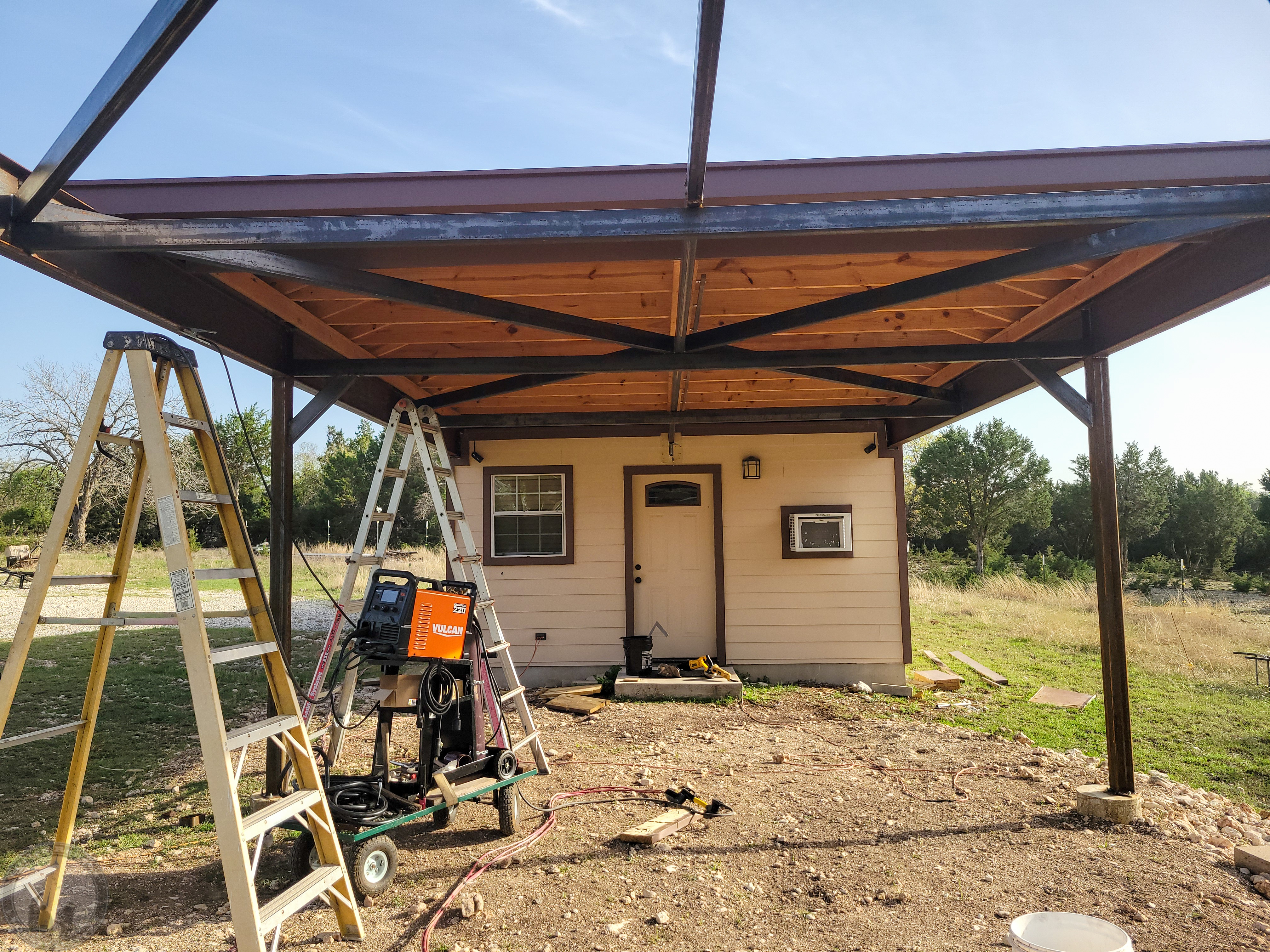 After buffing most of the paint and rust off of the old angle iron, I tacked the end and rolled the roof off, tacking as I went. The result ended up a bit wavy, so I'll probably cut a few of those welds and tweak, but the roof moves VERY smoothly! We were getting 30 MPH wind gusts and this never noticed (can't say the same for the inside of the observatory!). A far cry from when I first put up the rails and they would vibrate in the wind!