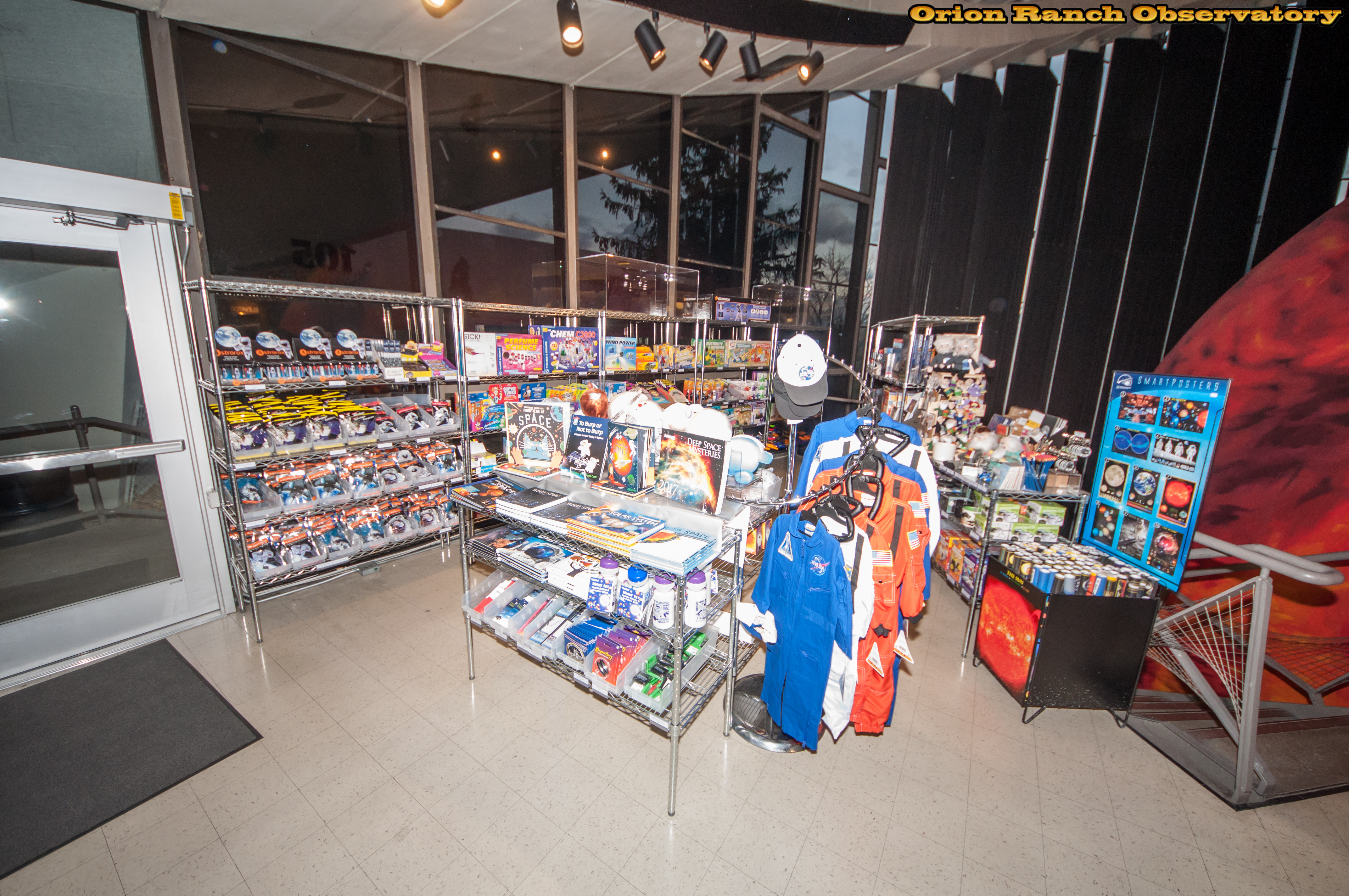 The entrance is through the gift shop and ticket counter. Quite a variety of shirts, science toys, posters, and even binoculars and telescopes.