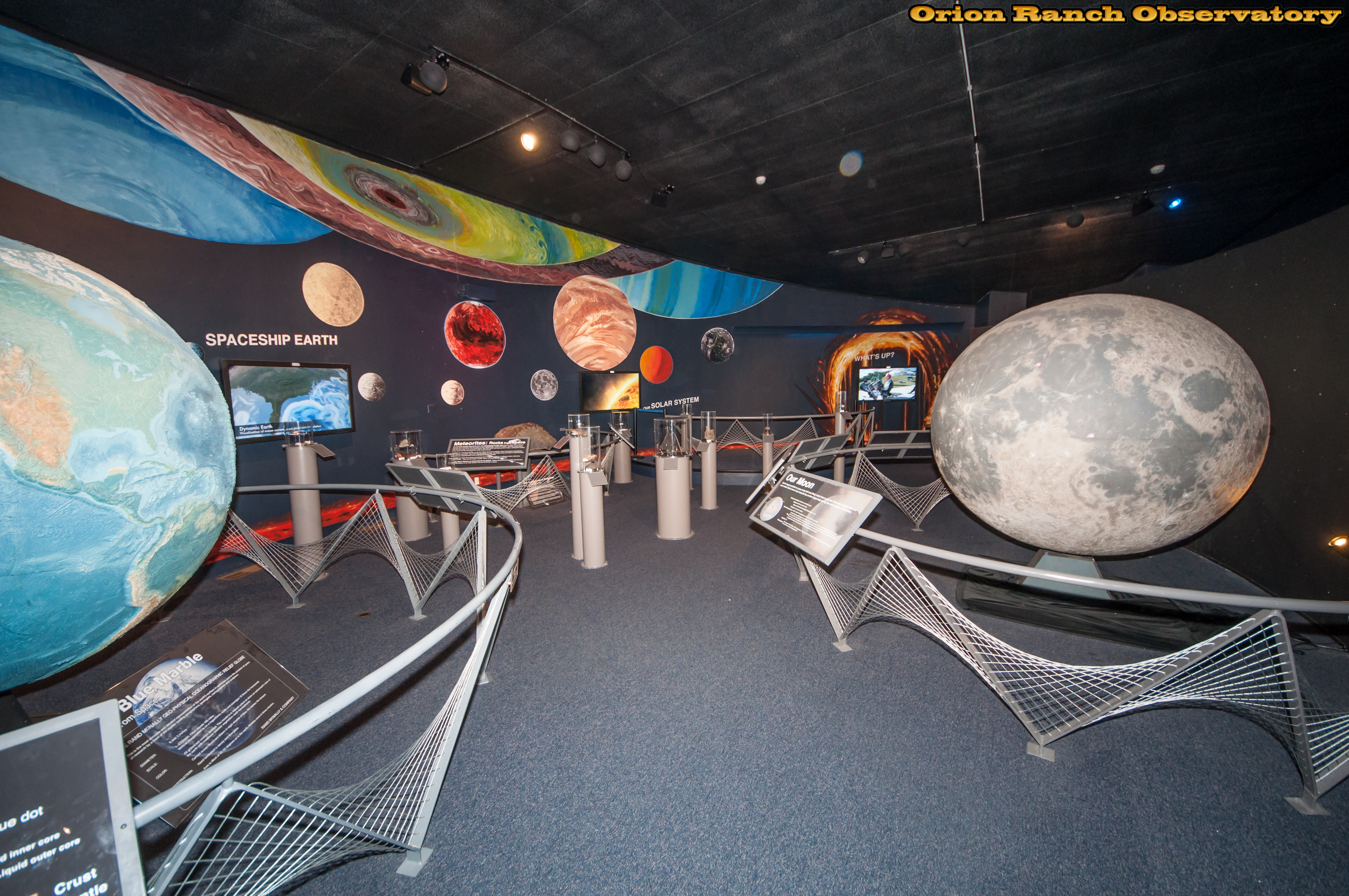 The exhibits are dominated by globes of the Earth and Moon, along with one huge meteorite surrounded by a number of smaller samples.