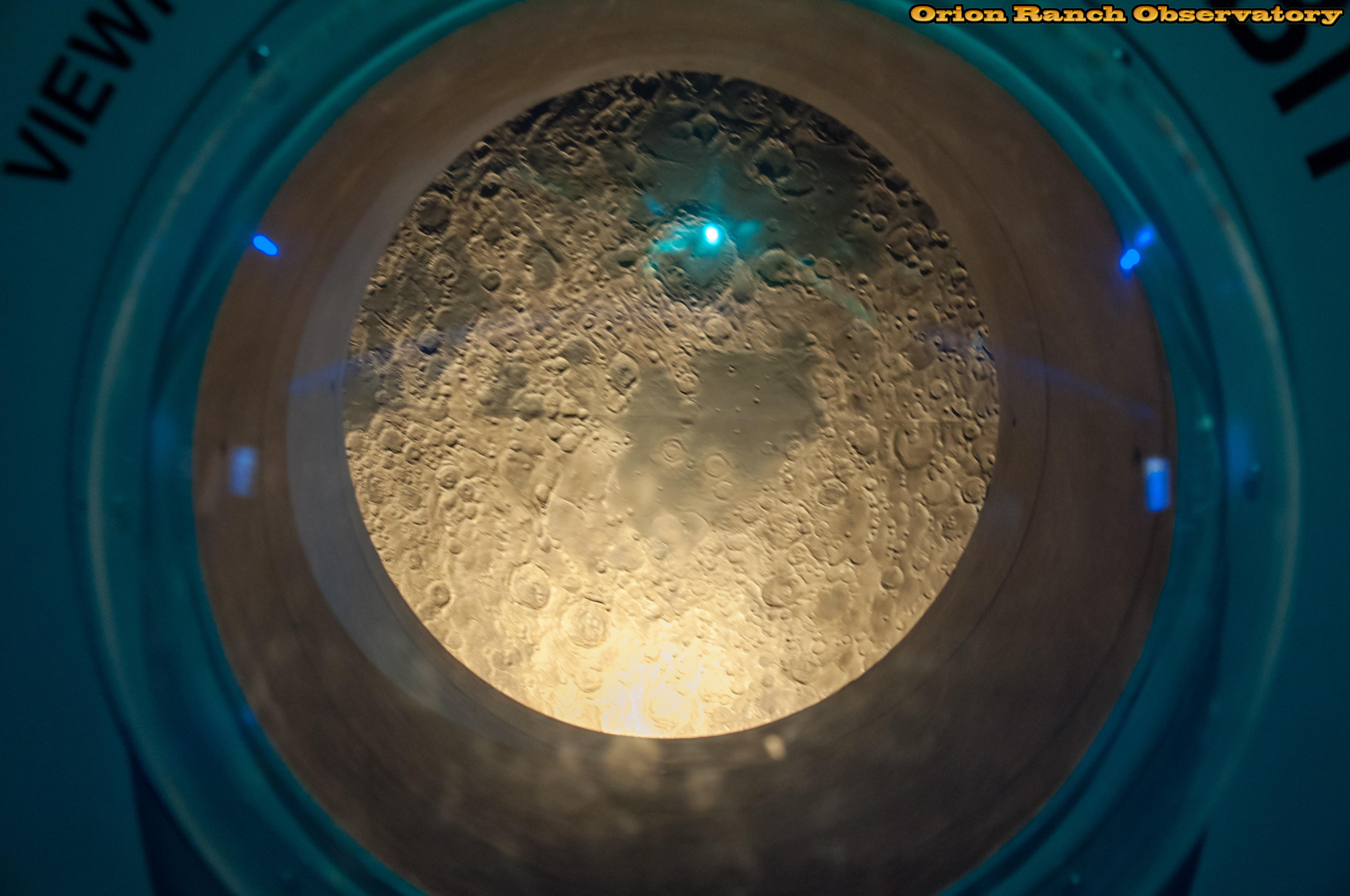 The various portholes in the entrance wall point to several of the paintings across the exhibit far wall. Most are just PVC pipe in the wall, but the central one gives a vew of orbiting the moon as the globe rotates.