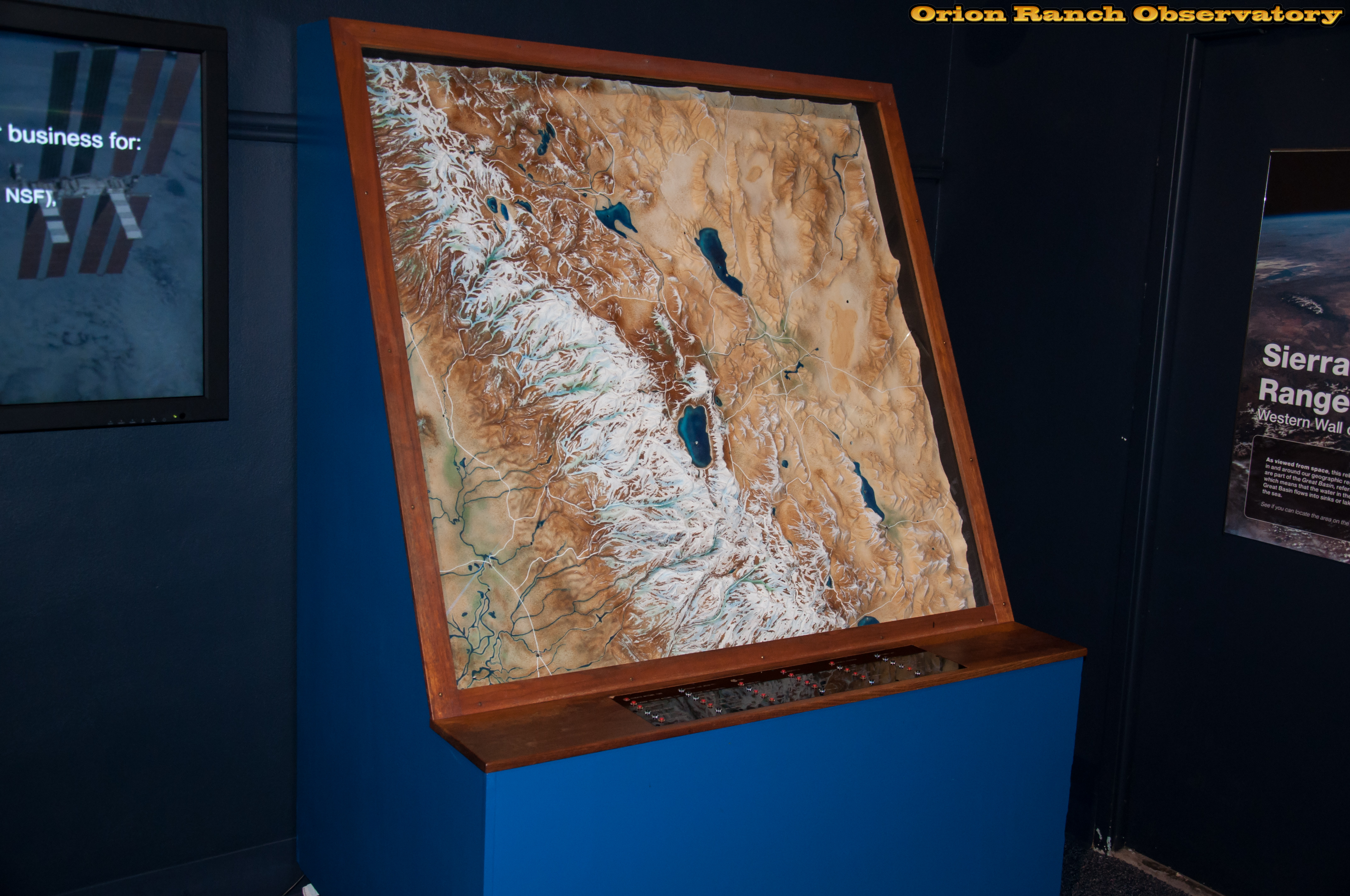 A topographical map and poster provide a bit of local information about the Sierra Nevada mountain range around Reno.