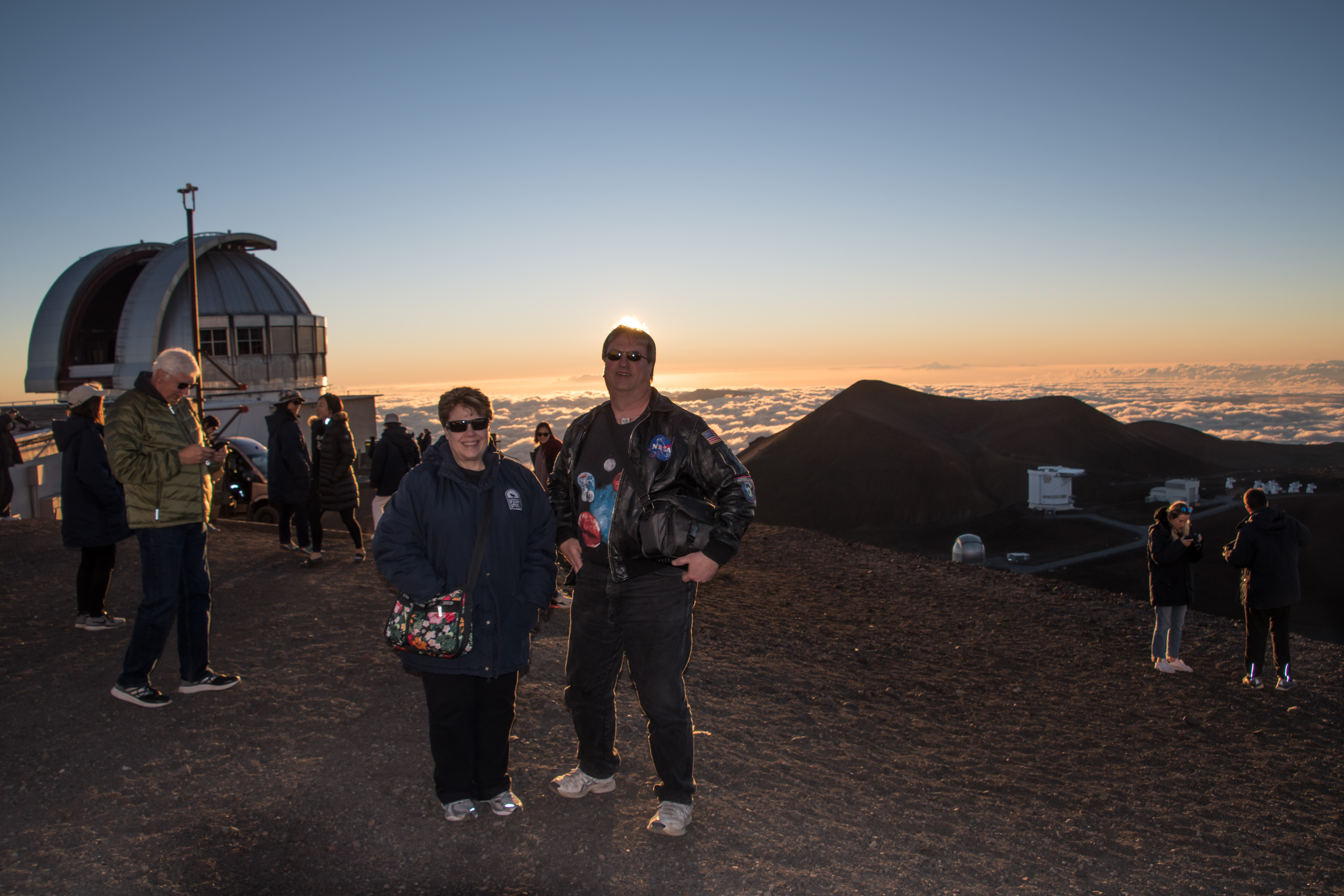 Michael and Machael in front of the UKIRT and submillimeter array as the Sun sets.