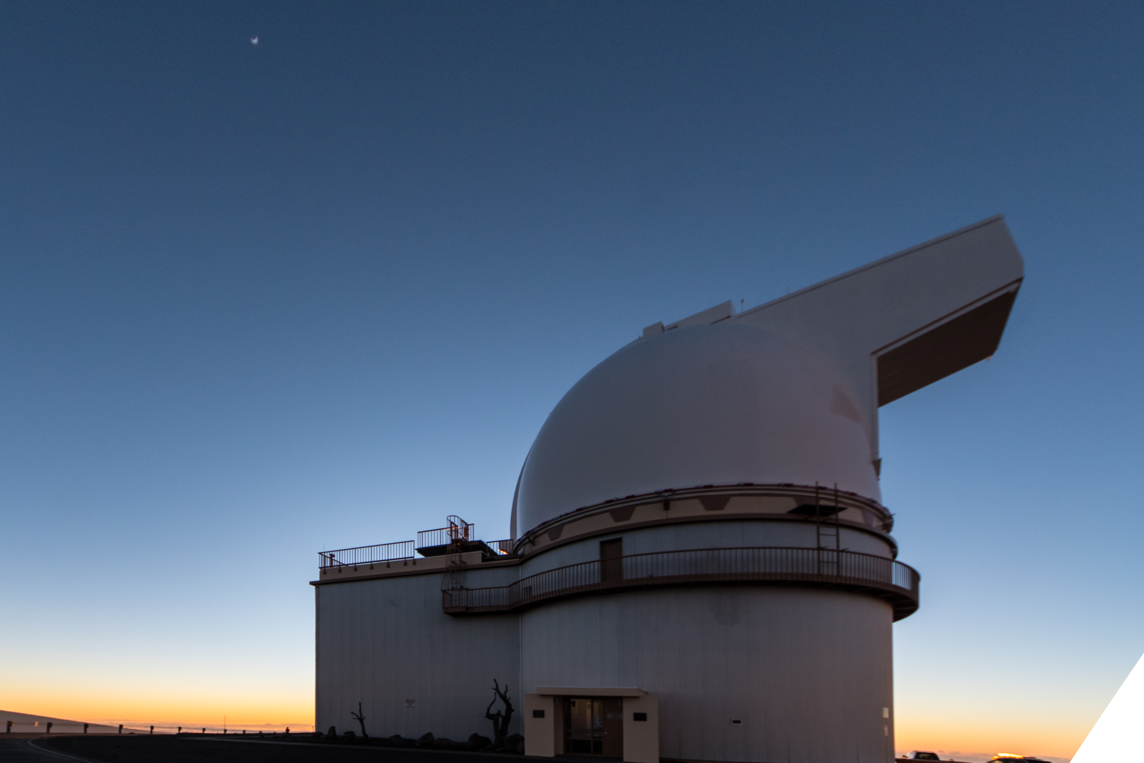 As the Sun sets, the crescent Moon is visible above the University of Hawaii 2.2 m Telescope dome. We would have preferred a new moon for this tour, but the weather was phenomenal, nonetheless.
