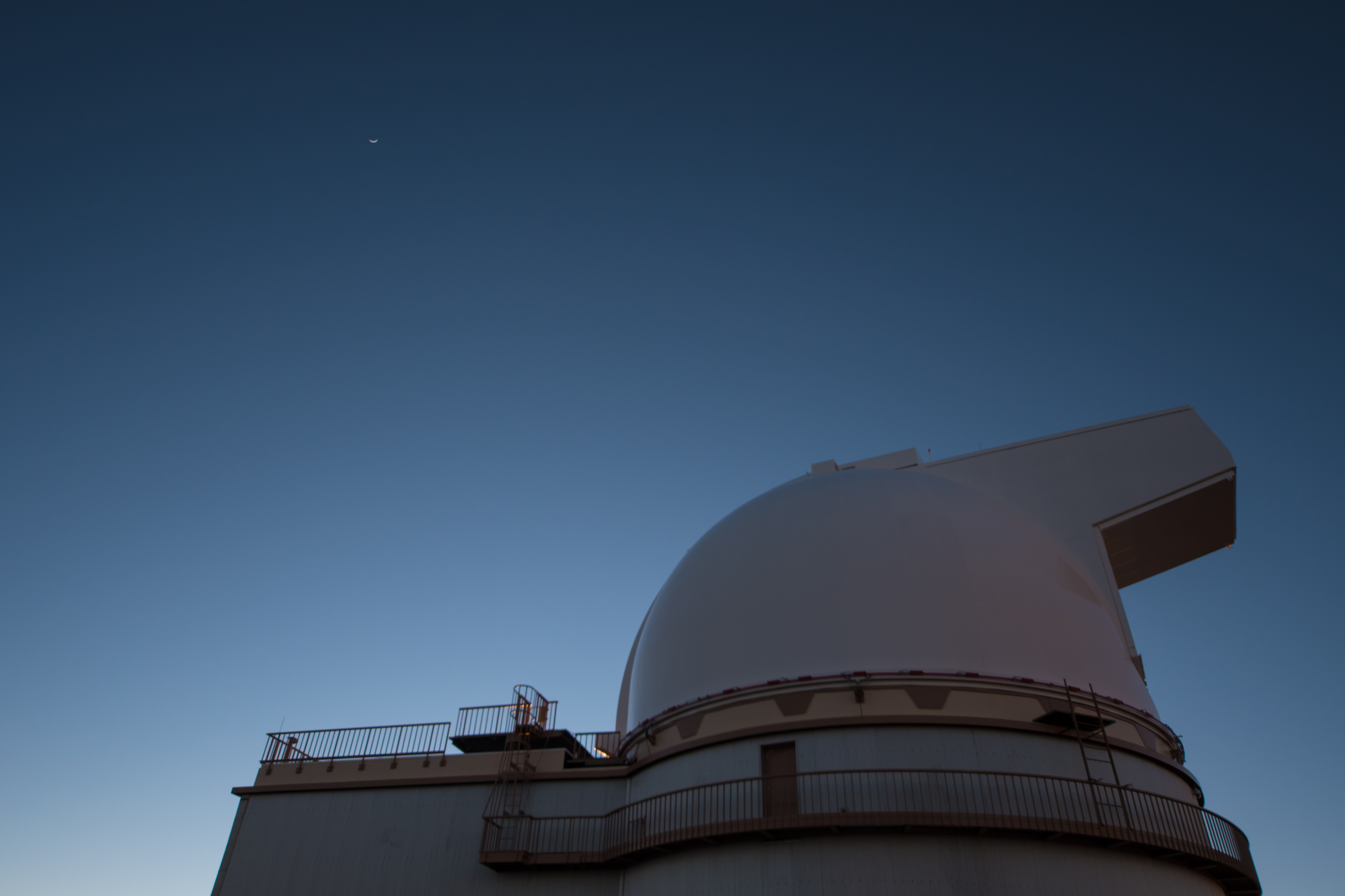 As the Sun sets, the crescent Moon is visible above the University of Hawaii 2.2 m Telescope dome. We would have preferred a new moon for this tour, but the weather was phenomenal, nonetheless.
