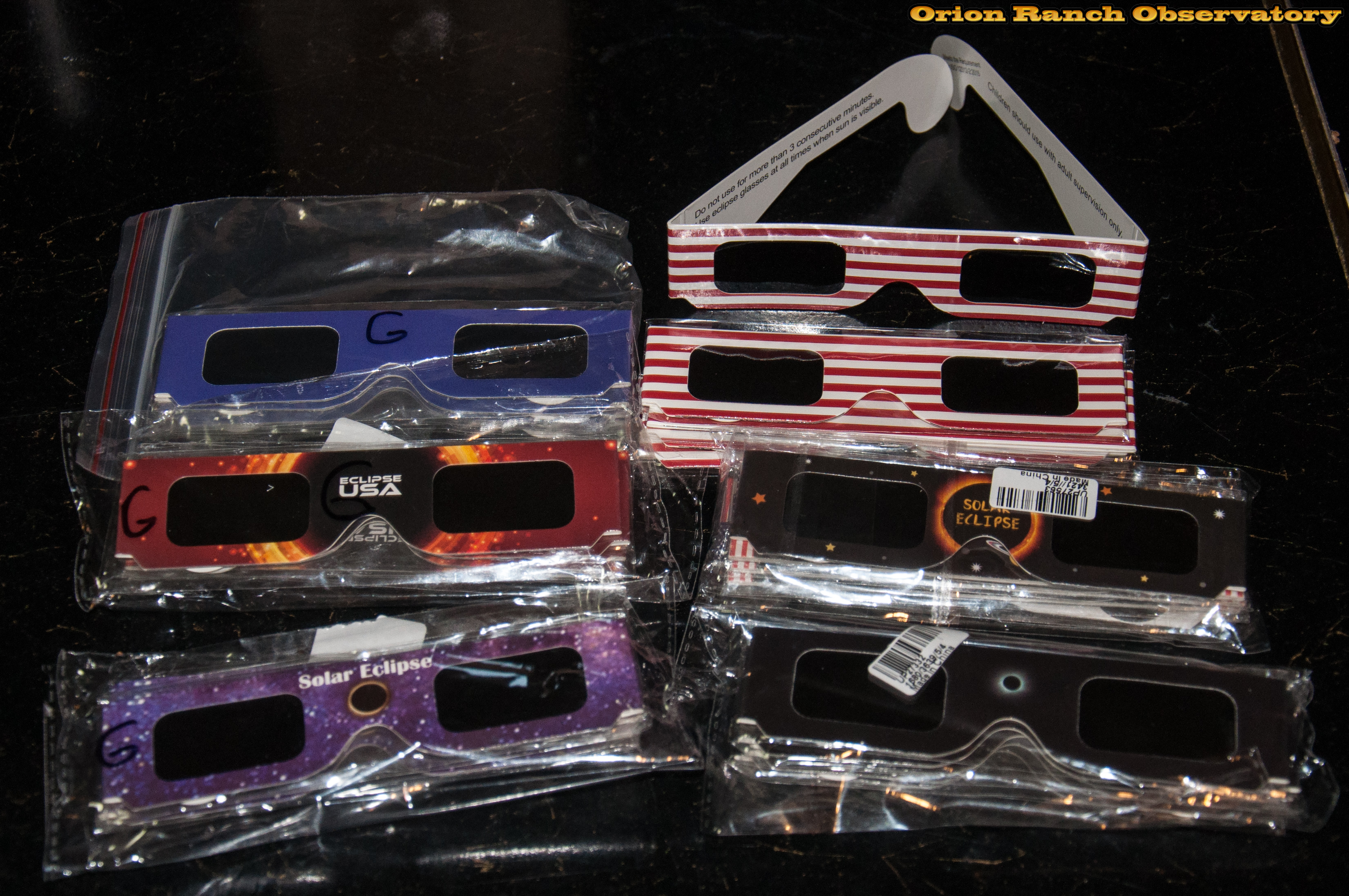 I ordered a 30 pack of the cardboard eclipse glasses containing six different styles off of Amazon. They were ordered on July 4th and arrived on July 19th, shipped from China. The ones marked with a G have much better light blocking than the ones on the right, but I'm still not sure if I can trust them.