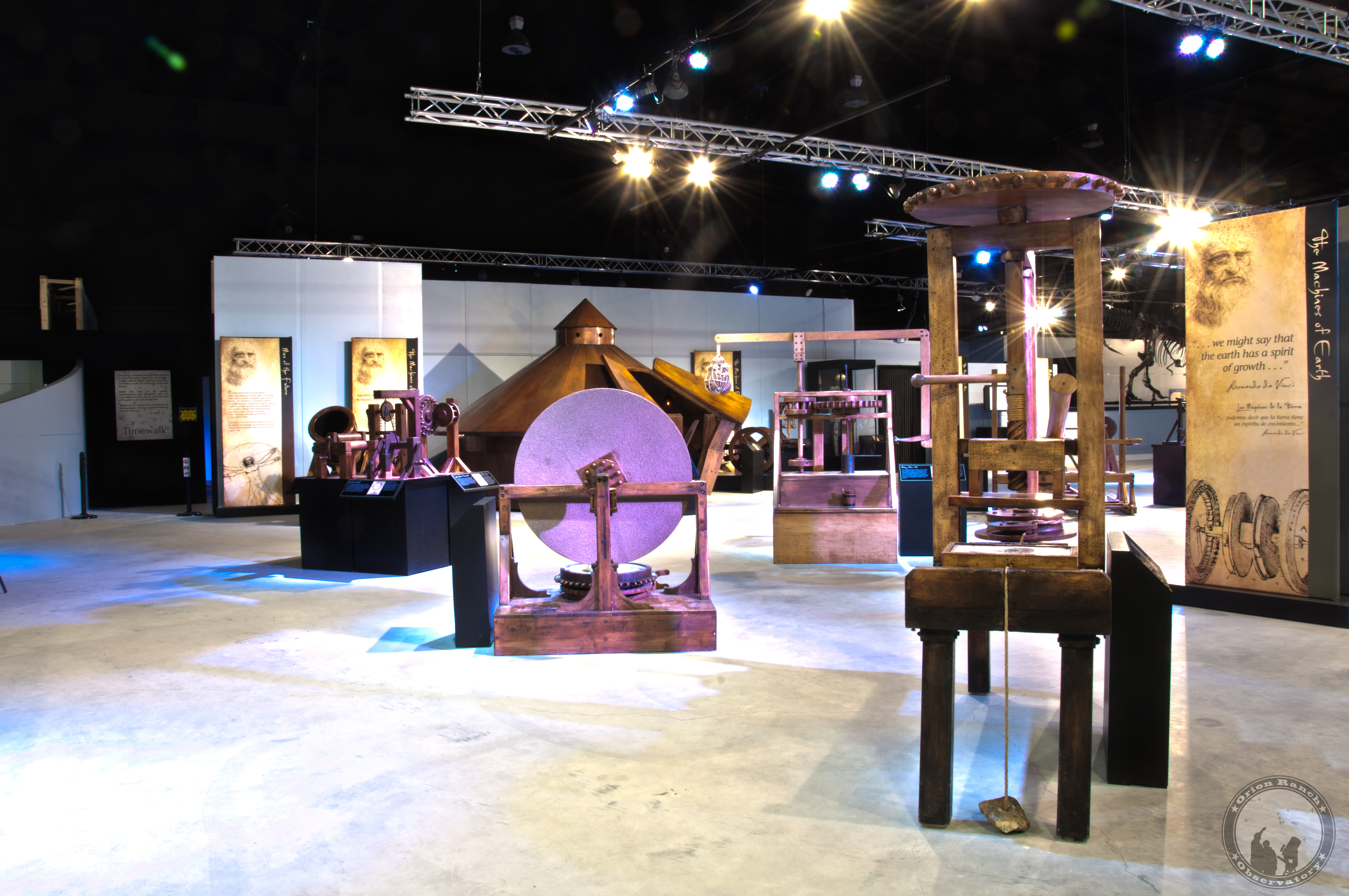 A view of about half the exhibit showing a printing press, mirror grinder, crane, lift, tank, canon, and various other structures.