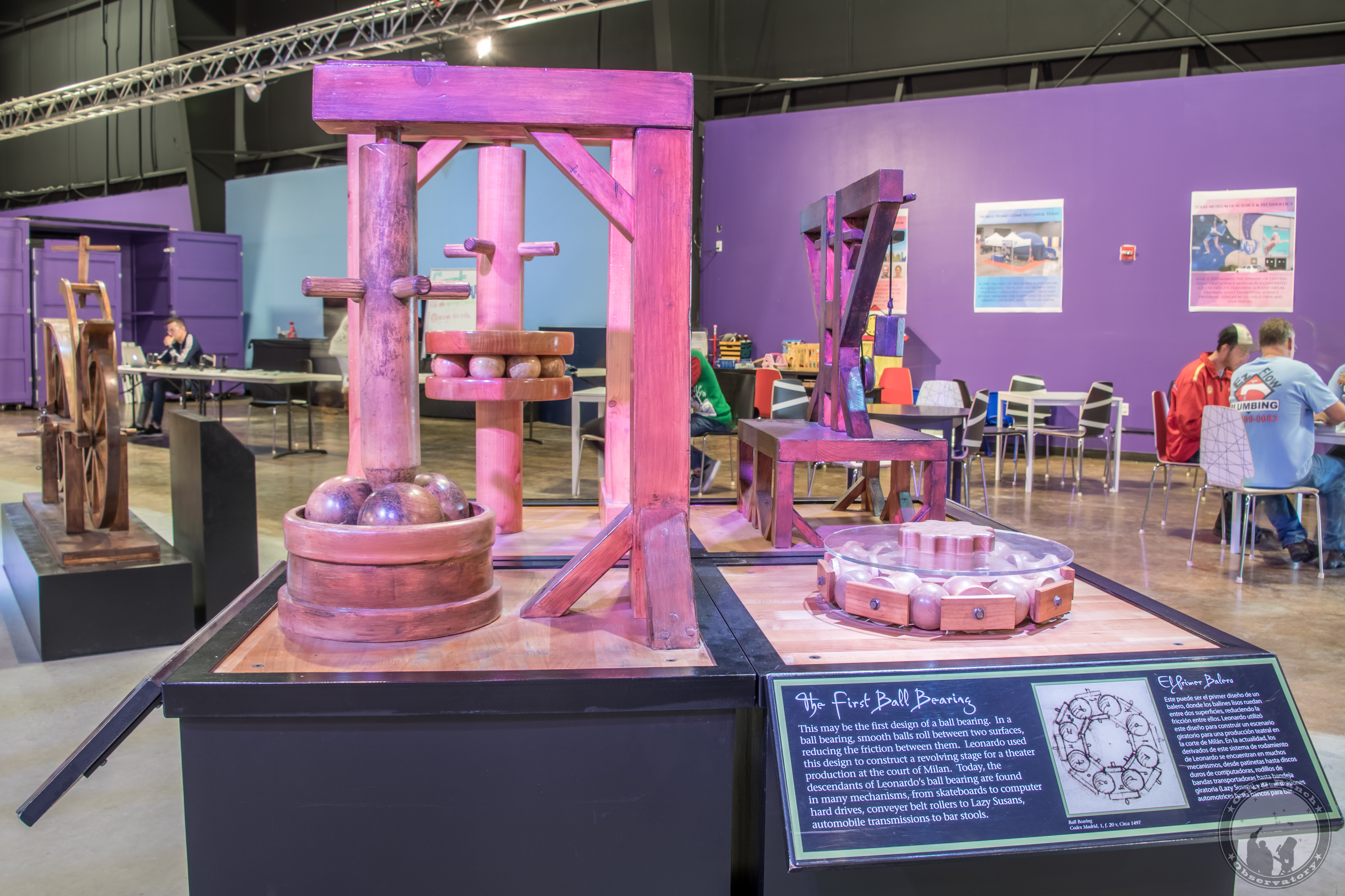 This may be the first design of a ball bearing. In a ball bearing, smooth balls roll between two surfaces, reducing the friction between then. Leonardo used this design to construct a revolving stage for a theater production at the court of Milan. Today, the descendants of Leonardo's ball bearing are found in many mechanisms, from skateboards to computer hard drives, conveyor belt rollers to Lazy Susans, automobile transmissions to bar stools.