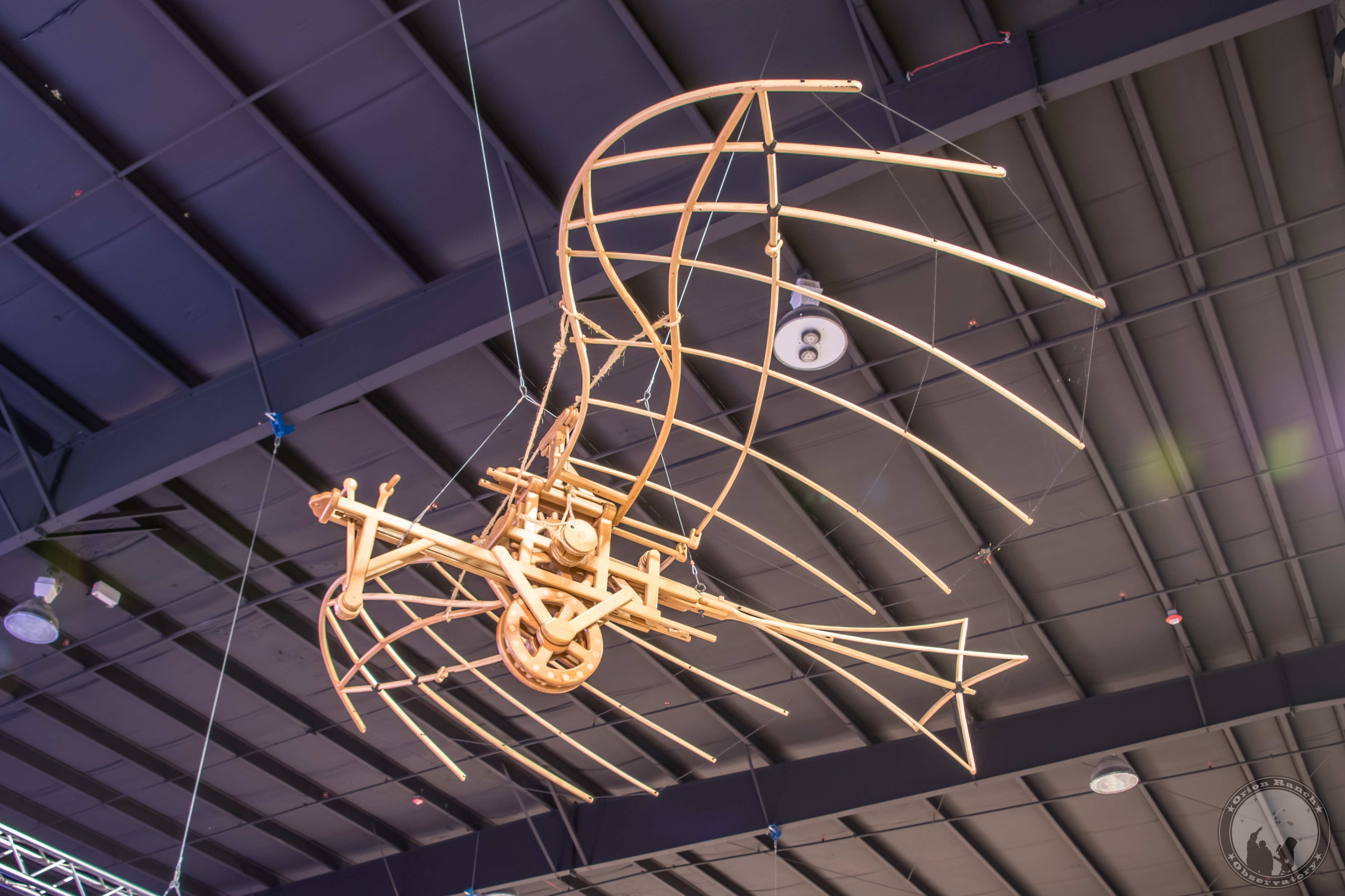 Leonardo's explorations of the motion of air were closely linked to his observations of water. Just as he studied how fish swim in currents of water, he investigated how birds fly in air currents and winds. He never designed a successful flying machine, but this machine represents the closest he came. It resembles today's hang gliders, except that the pilot not only hangs in the glider, but he adjusts the outer portions of the wings through a system of ropes and pulleys. Leonardo patterned his wings on bats and birds of prey.