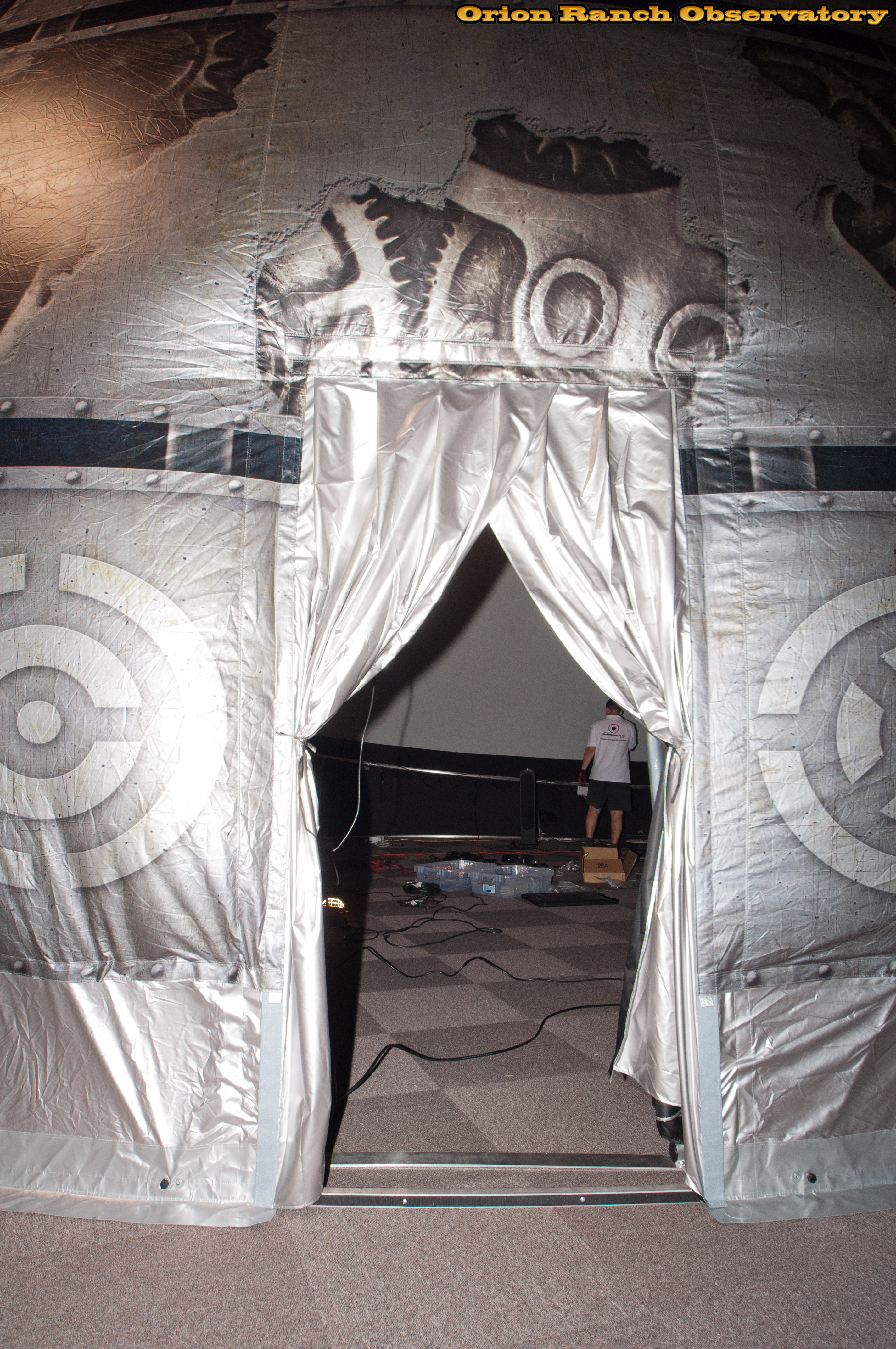 Various views around the planetarium dome, showing the air system that keeps the dome taught on the geodesic framework to keep the interior spherical. Some nice detail with the constallations and various other decorations.