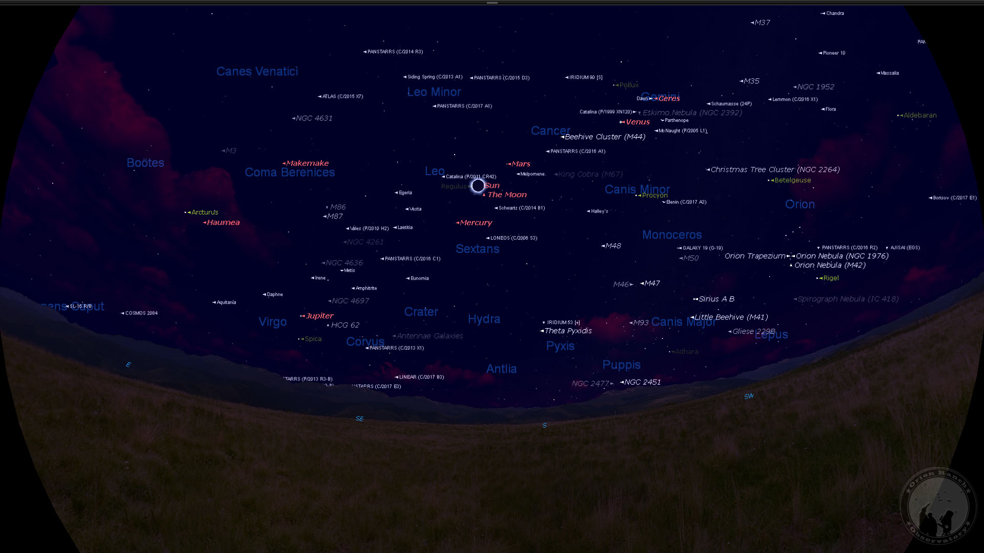 Here's what we should have been able to see at totality of the skies got dark enough with all the major objects labeled. A couple of these stars were visible, as was Venus and Jupiter. Sirius shows up in my photos just above the power line if you look closely (only about a pixel) and Jupiter may be in that bit of cloud on the left.