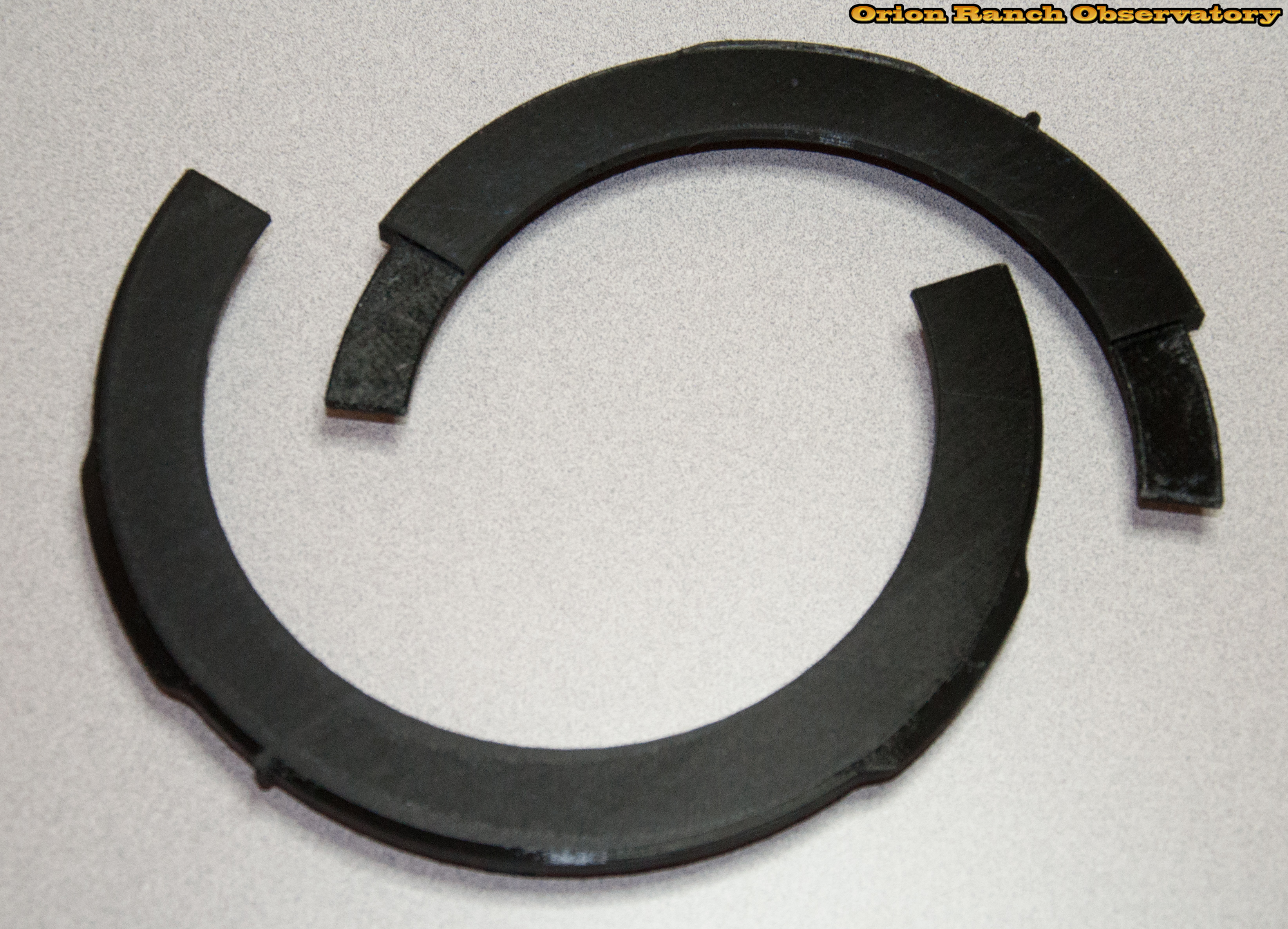Front and back views of the two segments of the full ring. Since I can't print the full ring, it's segmented into a 1/3 segment with fingers at the halfway point.