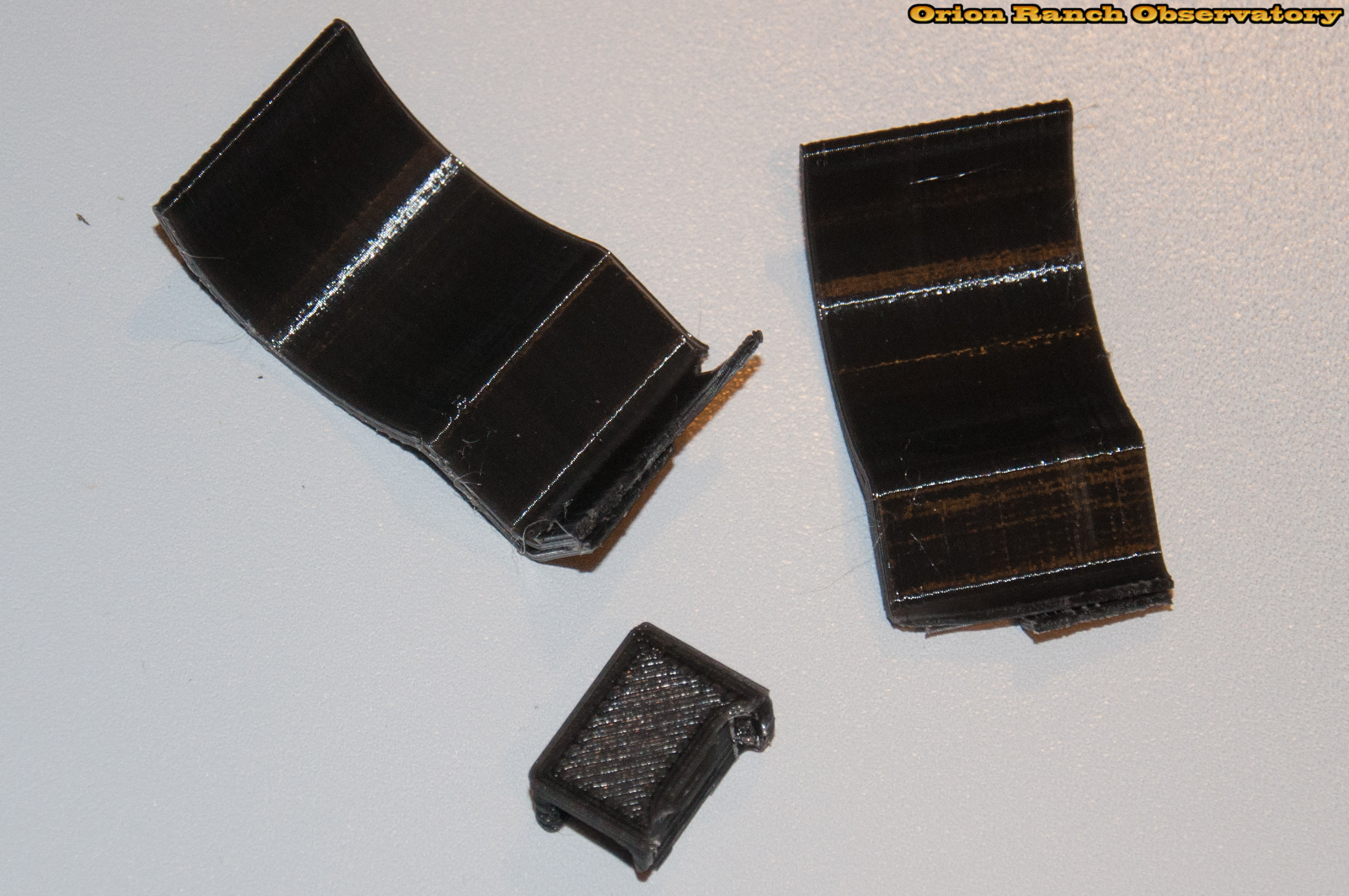I tested one of the partially completed leg clips where I'd run out of filament. As expected, it broke at the narrow back end, which is generally the weakest point with the most leverage on it, but I had to get it pretty wide to make it break. I was not able to break the two remaining curves by hand at all. Again, I'll beef up the slot a bit to ensure it holds, since I also plan to increase the capture force on the clip even further.
