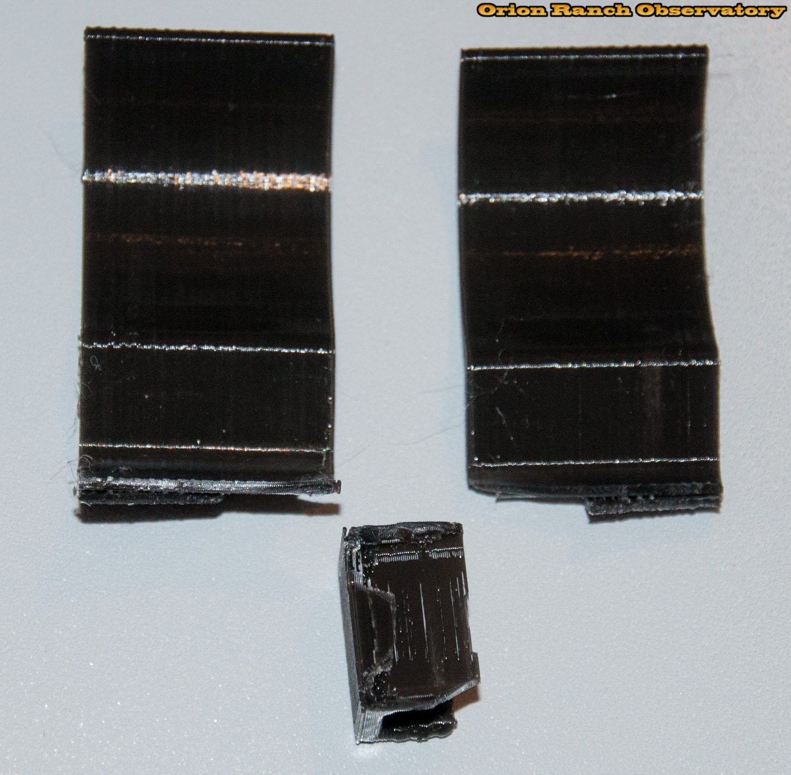 I tested one of the partially completed leg clips where I'd run out of filament. As expected, it broke at the narrow back end, which is generally the weakest point with the most leverage on it, but I had to get it pretty wide to make it break. I was not able to break the two remaining curves by hand at all. Again, I'll beef up the slot a bit to ensure it holds, since I also plan to increase the capture force on the clip even further.