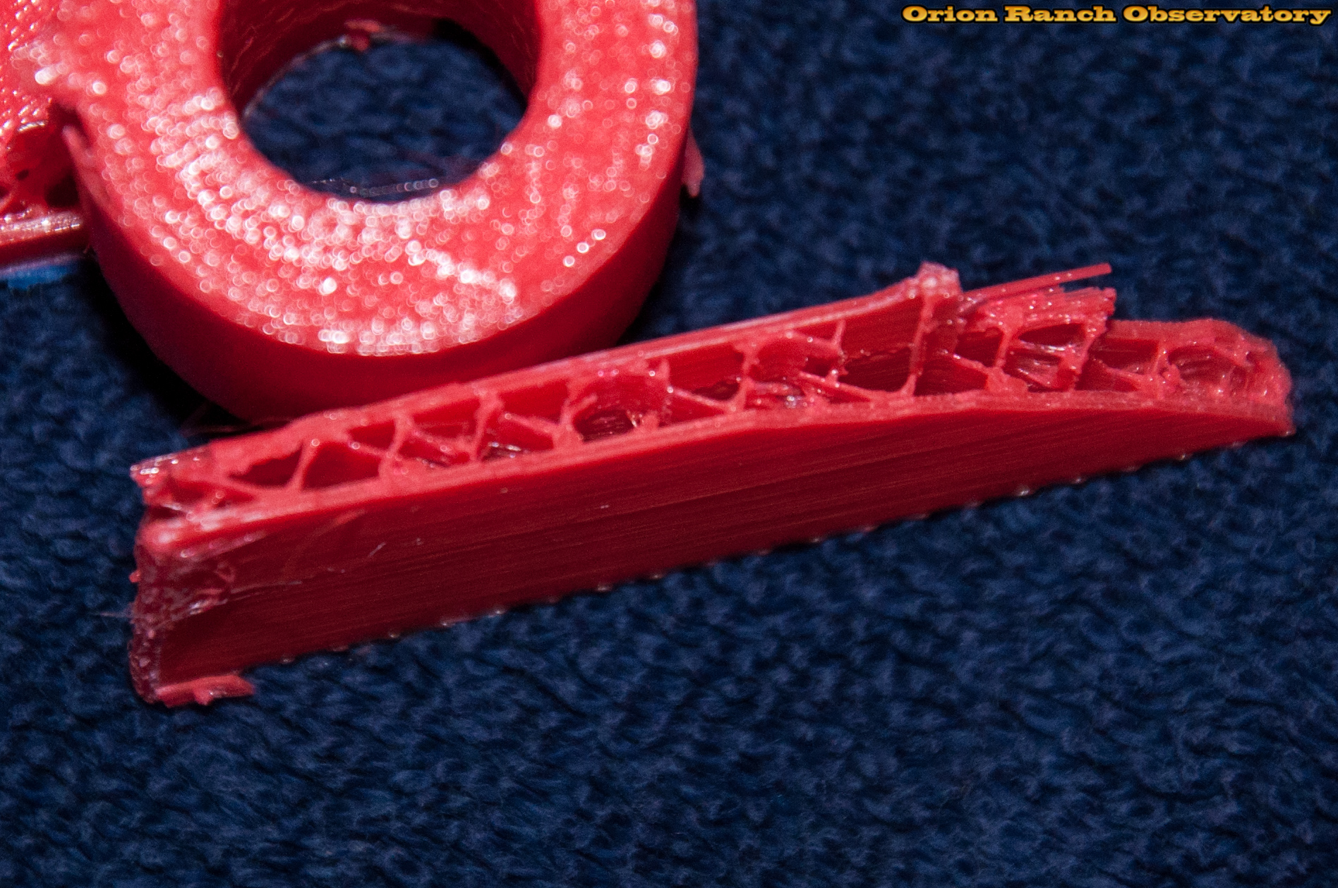 I'm satisfied with the structural strength of the various leg spreaders I designed when used under static conditions, but I am worried about the potential for catastrophic failure if some kid at a star party decides to fall on it or something. Thus I analyzed the strength of an unused prototype wedge segment of a sectional spreader to see what it took to break it. The failure points were pretty much where I'd expect. starting at the narrowest section of the wedge around the storage slot. It took quite a bit to break it, but once you hear the crack, you know it's about gone and it breaks the rest of the way relatively quickly. From there I was also able to break the thinner parts of the rib without a ton of effort. There were certain directions though that I couldn't break by hand on the smaller pieces. I should note that I broke this by twisting about the weakest part of a single section, whereas when assembled and installed, the combination of forces in play tend to be in directions where the structural strength is much higher. However, based on this test I'll probably make a couple of changes, both to the design of this particular part to beef up the junction between the rib and the body and to the print settings to use the heavier shell and infill that I had been using on earlier prints before I upgraded my printer.