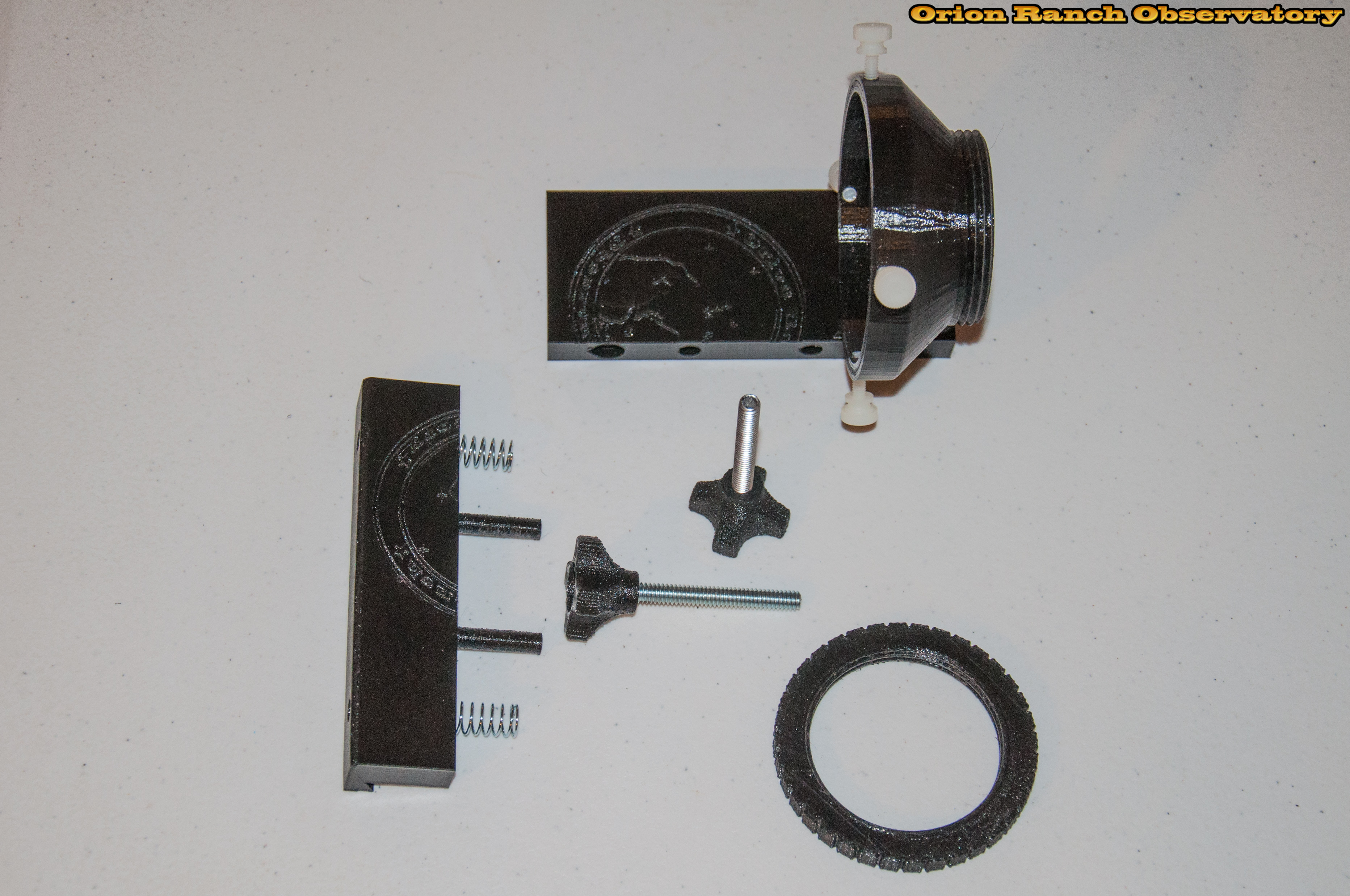 The main adapter body and larger part of the rail are printed together. The clamp assembly includes two guide pins, and springs go around the 1/4-20 bolts used to clamp it. The carriage bolts press fit into the knobs and the clamp ring screws on outside to hold the lens tightly. Not shown is the internal ring for holding the filter, which is taken from the r
