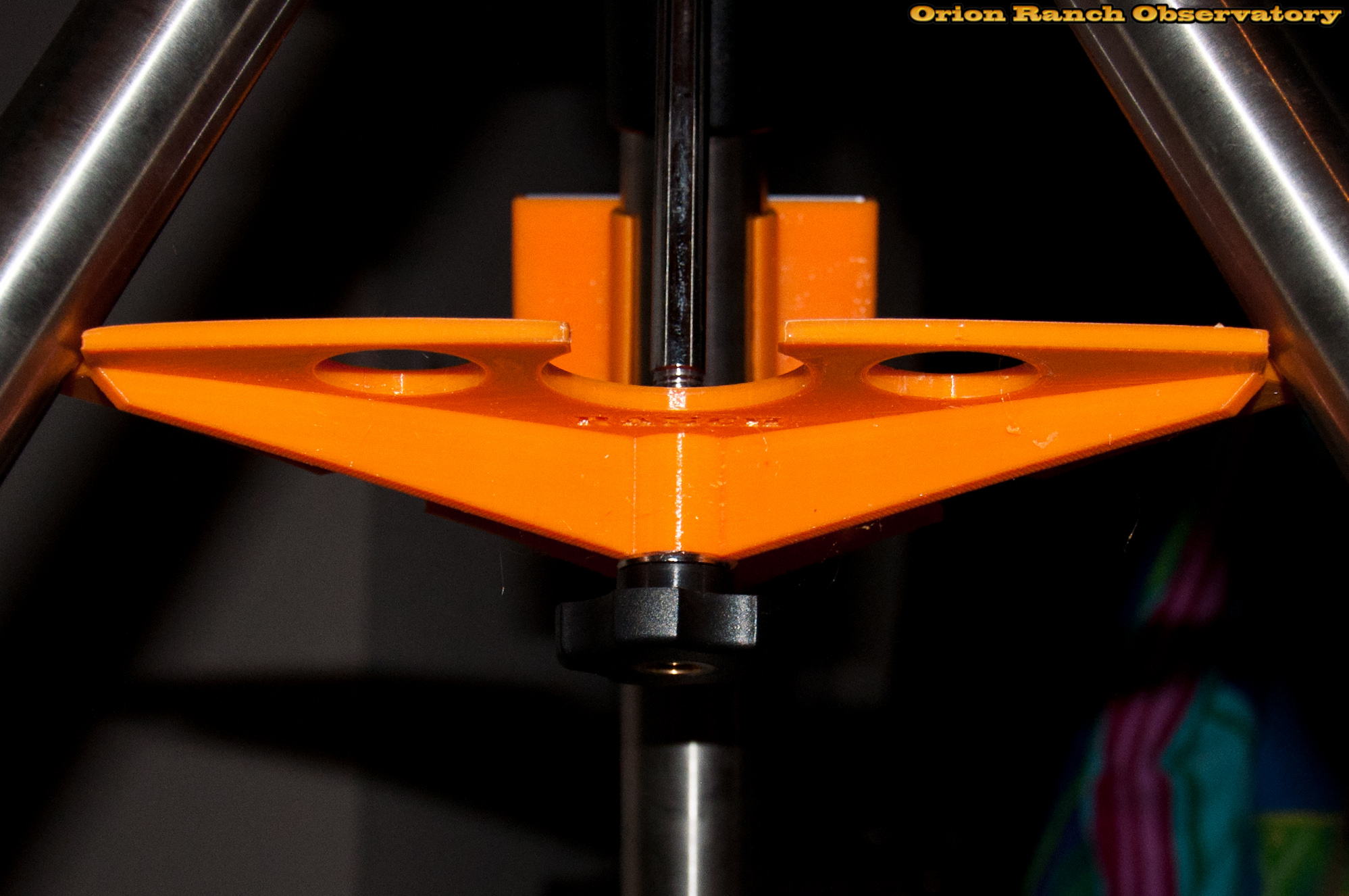 Here the legs are locked open with the spreader. With the larger radius (maximum I could print) and taller center column (both for a stronger rib and to increase height) the knob only needs to go on a few turns. I may actually shorten the center tube slightly to give a bit more release to toggle to closed mode. As is, the knob has to almost come off completely to toggle modes.