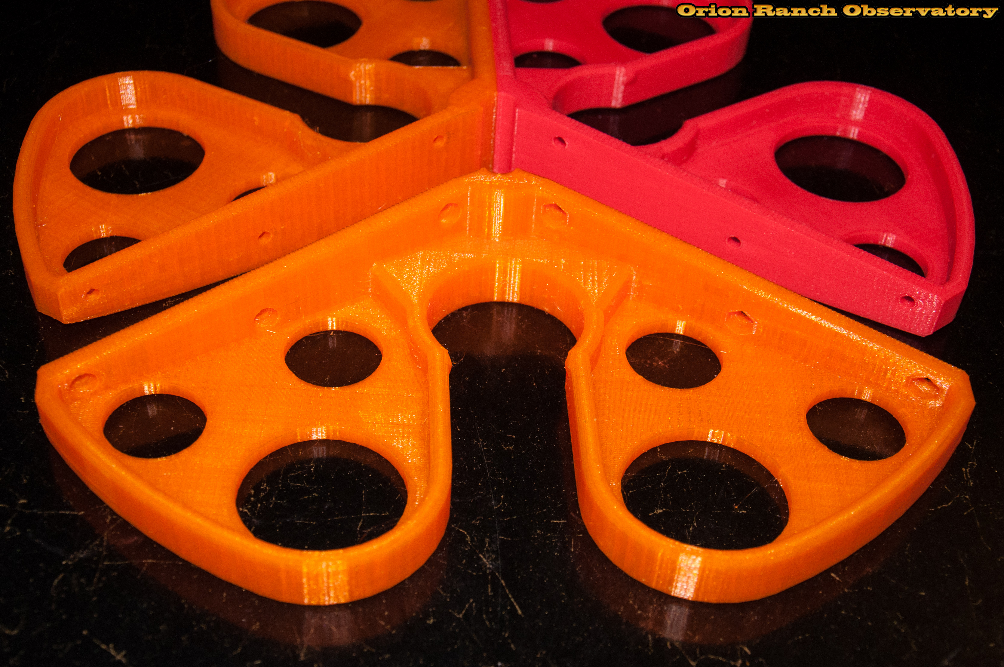This design makes the center rib taller and thicker, and adds a rib all around the rim to prevent any mishaps there with the eyepiece holders. Instead of the clips. this uses three machine screws and nuts per joint ($1 at Walmart) utilizing the thickness of the clip in the part itself. Rather than the one-piece center hole, each part has its own rib, and the perimeter rib attaches to the center around the 2" slot.