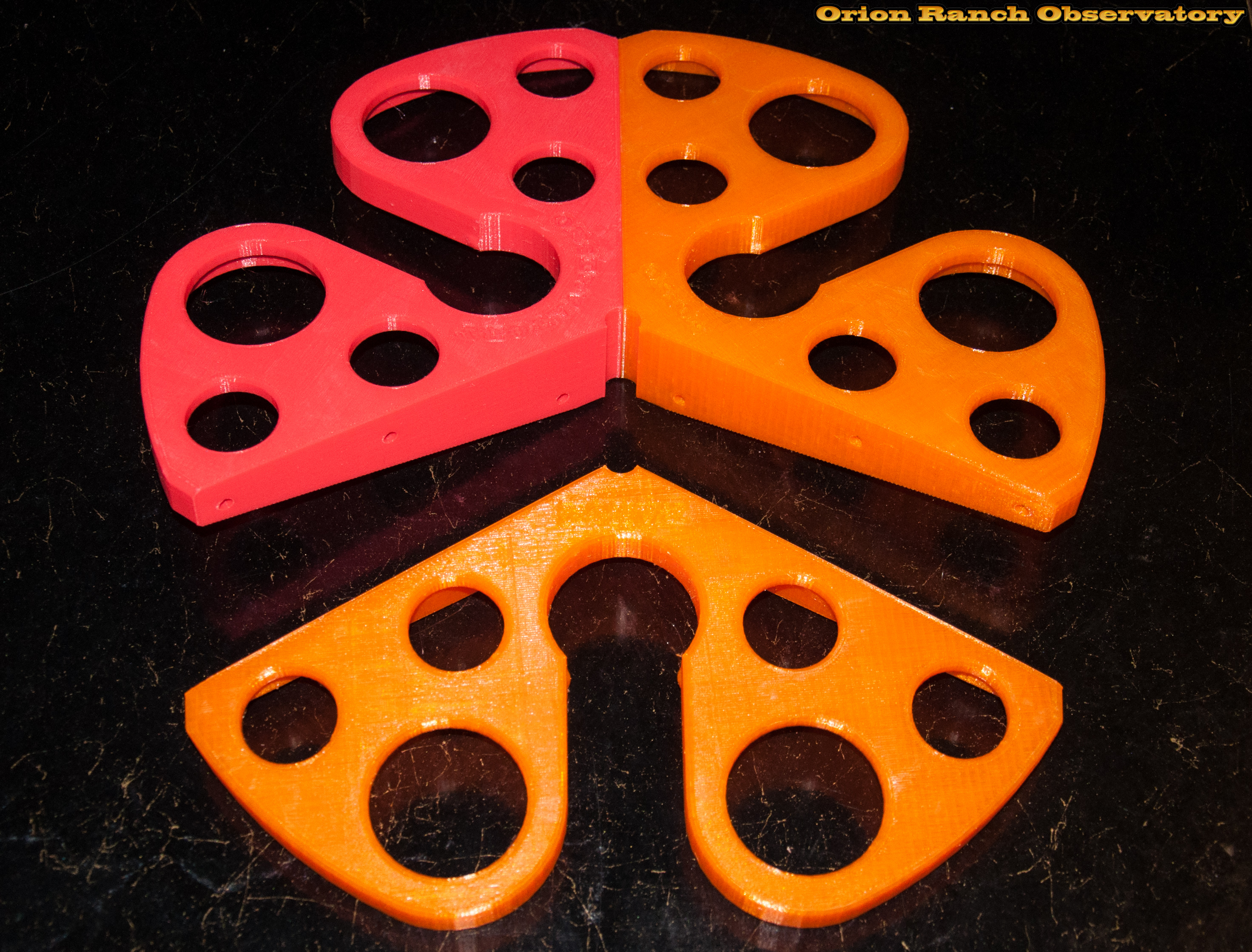 This design makes the center rib taller and thicker, and adds a rib all around the rim to prevent any mishaps there with the eyepiece holders. Instead of the clips. this uses three machine screws and nuts per joint ($1 at Walmart) utilizing the thickness of the clip in the part itself. Rather than the one-piece center hole, each part has its own rib, and the perimeter rib attaches to the center around the 2" slot.
