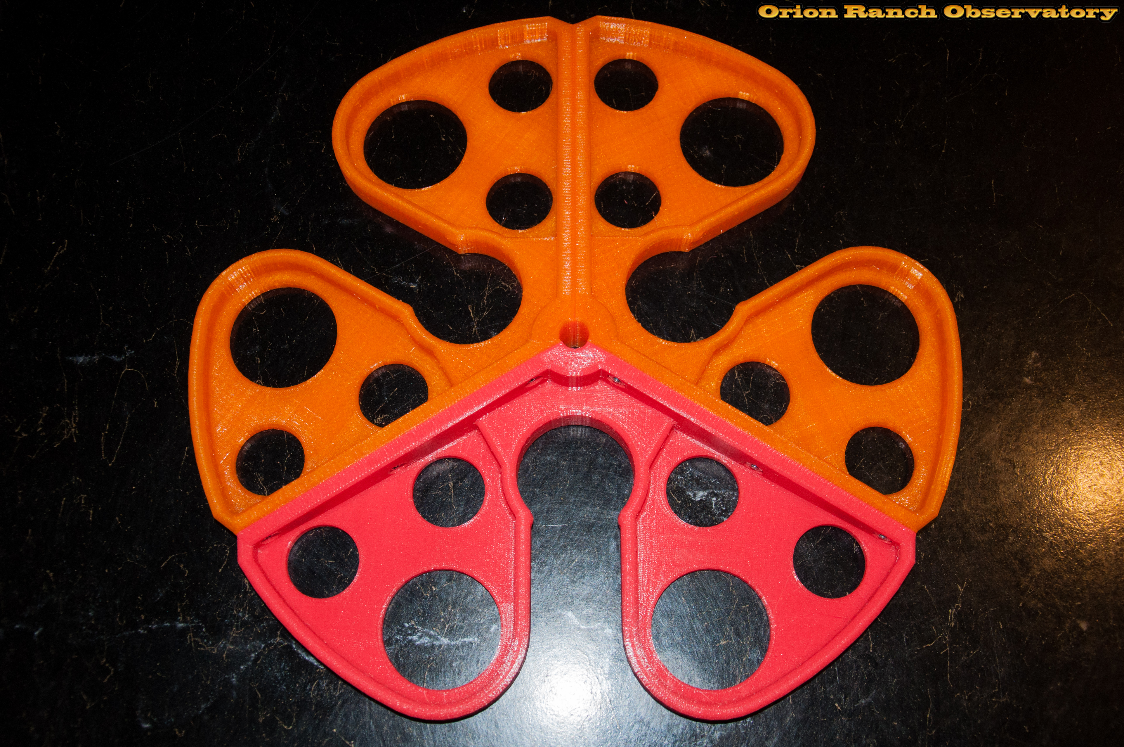 This design makes the center rib taller and thicker, and adds a rib all around the rim to prevent any mishaps there with the eyepiece holders. Instead of the clips. this uses three machine screws and nuts per joint ($1 at Walmart) utilizing the thickness of the clip in the part itself. Rather than the one-piece center hole, each part has its own rib, and the perimeter rib attaches to the center around the 2" slot.