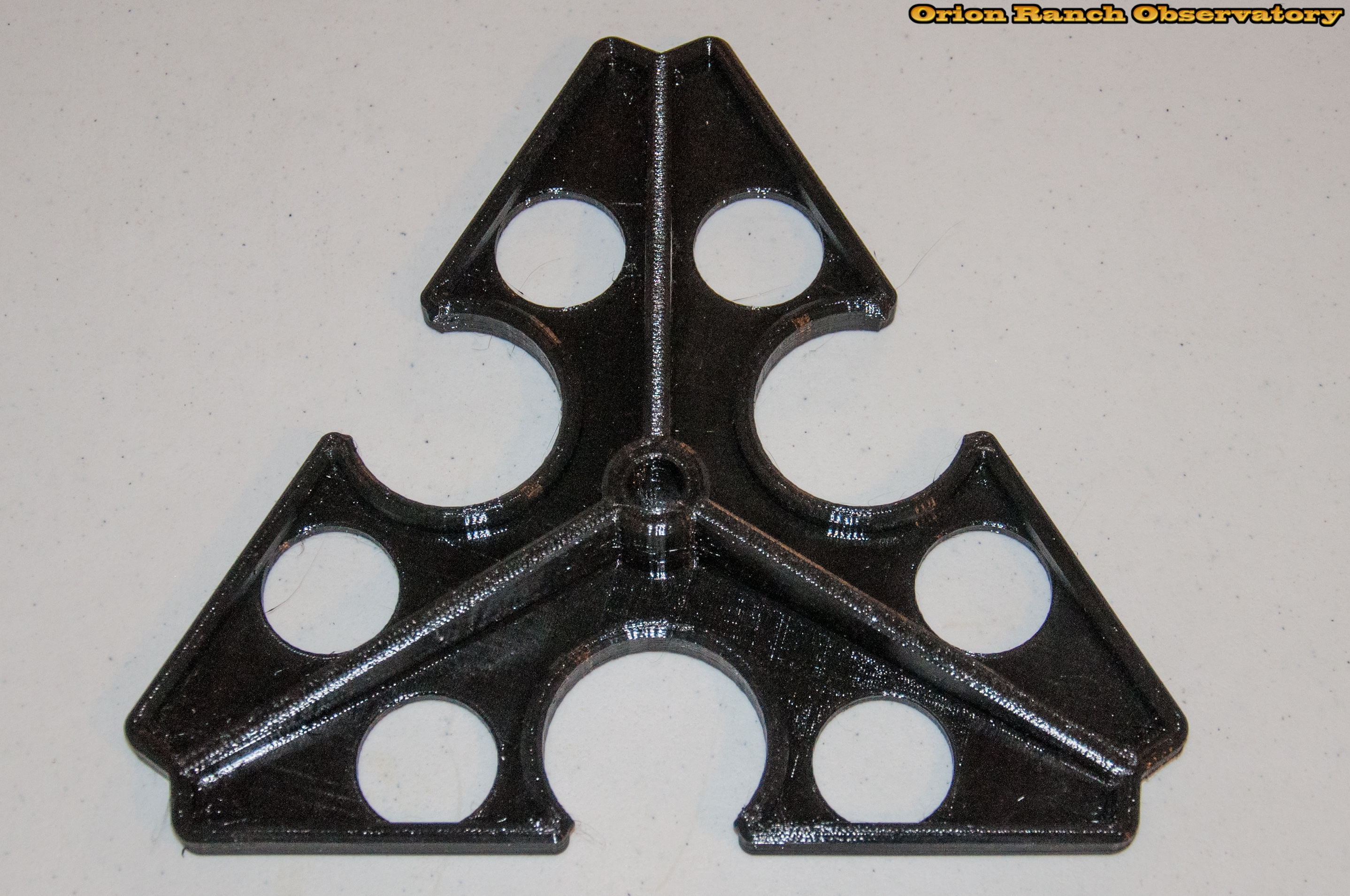 This is the latest revision of the delta spreader (really about the fifth revision) adding a reinforcement rib around the perimeter, as well as increasing the height of the main ribs slightly. The edges are also chamfered to provide a nice finished look. Printing with a raft to keep the parts flat provides a semi wood textured surface, providing a high friction surface.