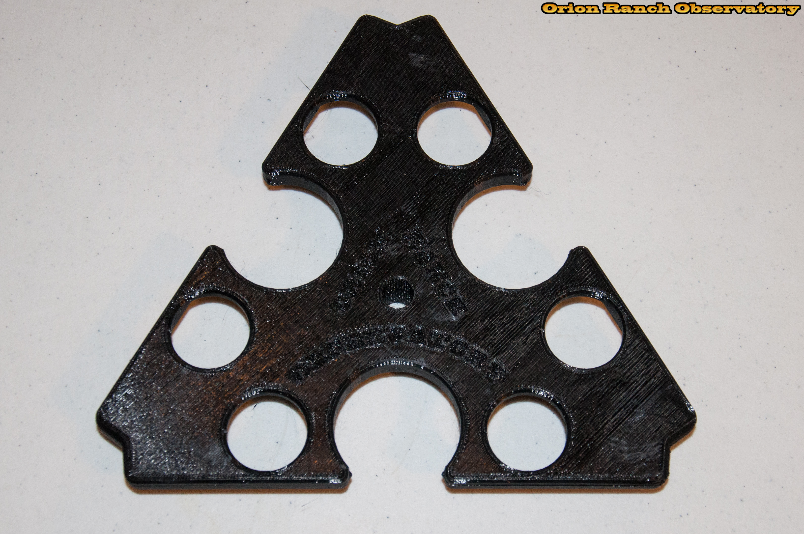 This is the latest revision of the delta spreader (really about the fifth revision) adding a reinforcement rib around the perimeter, as well as increasing the height of the main ribs slightly. The edges are also chamfered to provide a nice finished look. Printing with a raft to keep the parts flat provides a semi wood textured surface, providing a high friction surface.