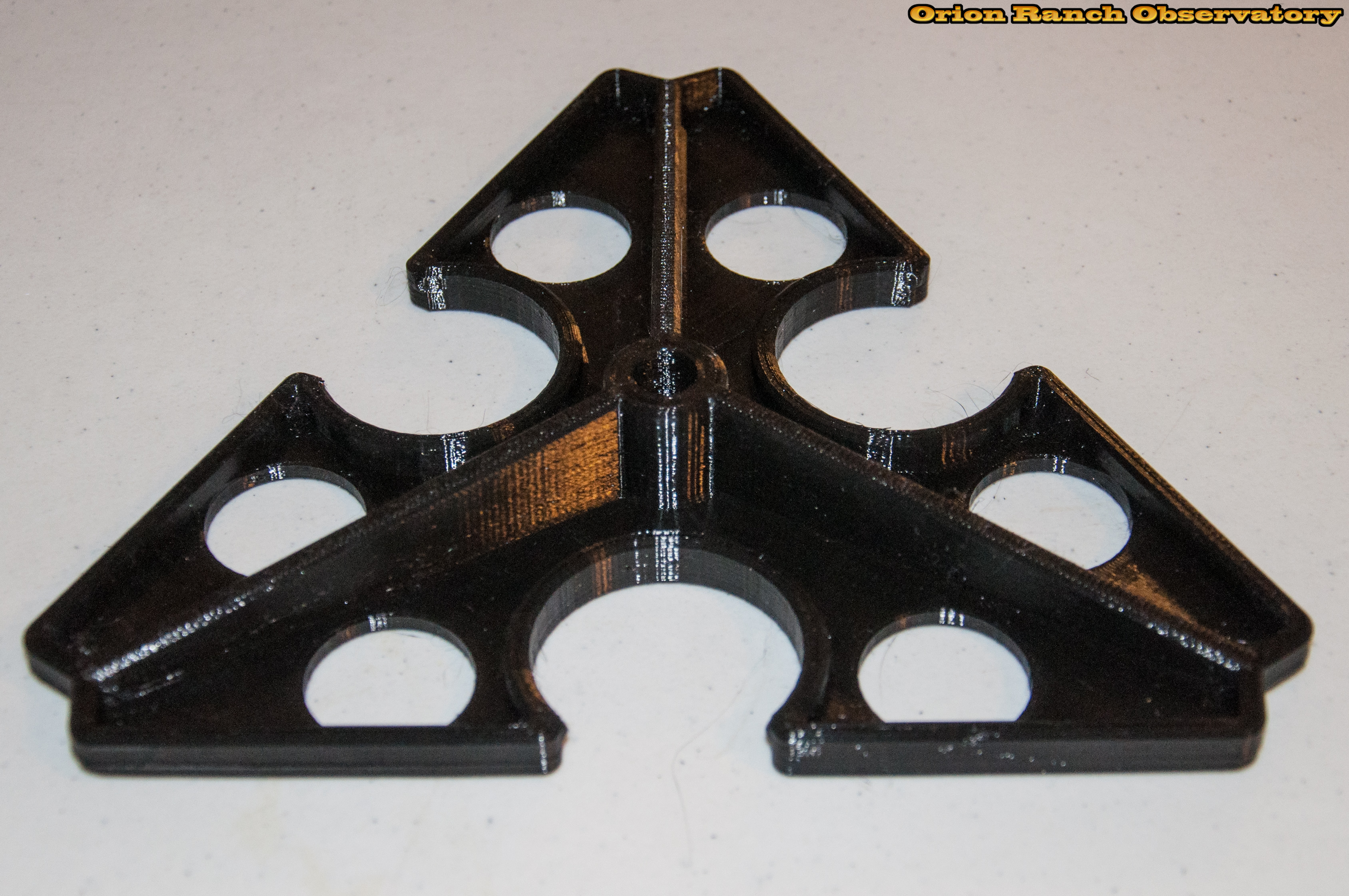 This is the latest revision of the delta spreader (really about the fifth revision) adding a reinforcement rib around the perimeter, as well as increasing the height of the main ribs slightly. The edges are also chamfered to provide a nice finished look. Printing with a raft to keep the parts flat provides a semi wood textured surface, providing a high friction surface.