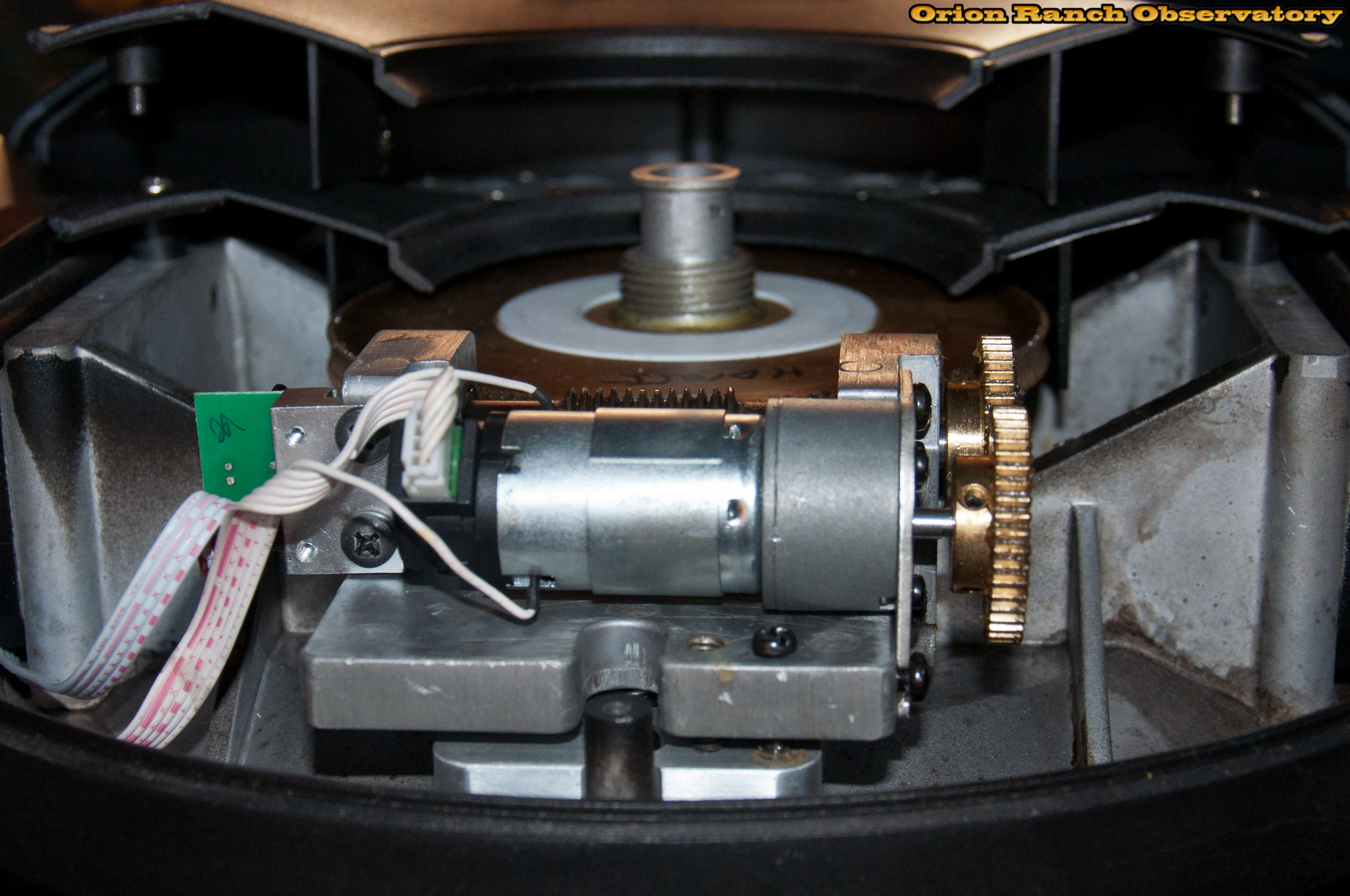 The spur gear servo motor drive turns the worm gear on the far side. You can see the black encoder on the back of the servo and the PEC reference sensor on the main worm gear shaft. The spur gears connecting the motor to the output shaft are typically covered with a shroud. Not sure why my unit doesn't have it. Also not sure why they need a 1:1 gear vs. finding the space to direct drive the worm and eliminate that additional point of play.