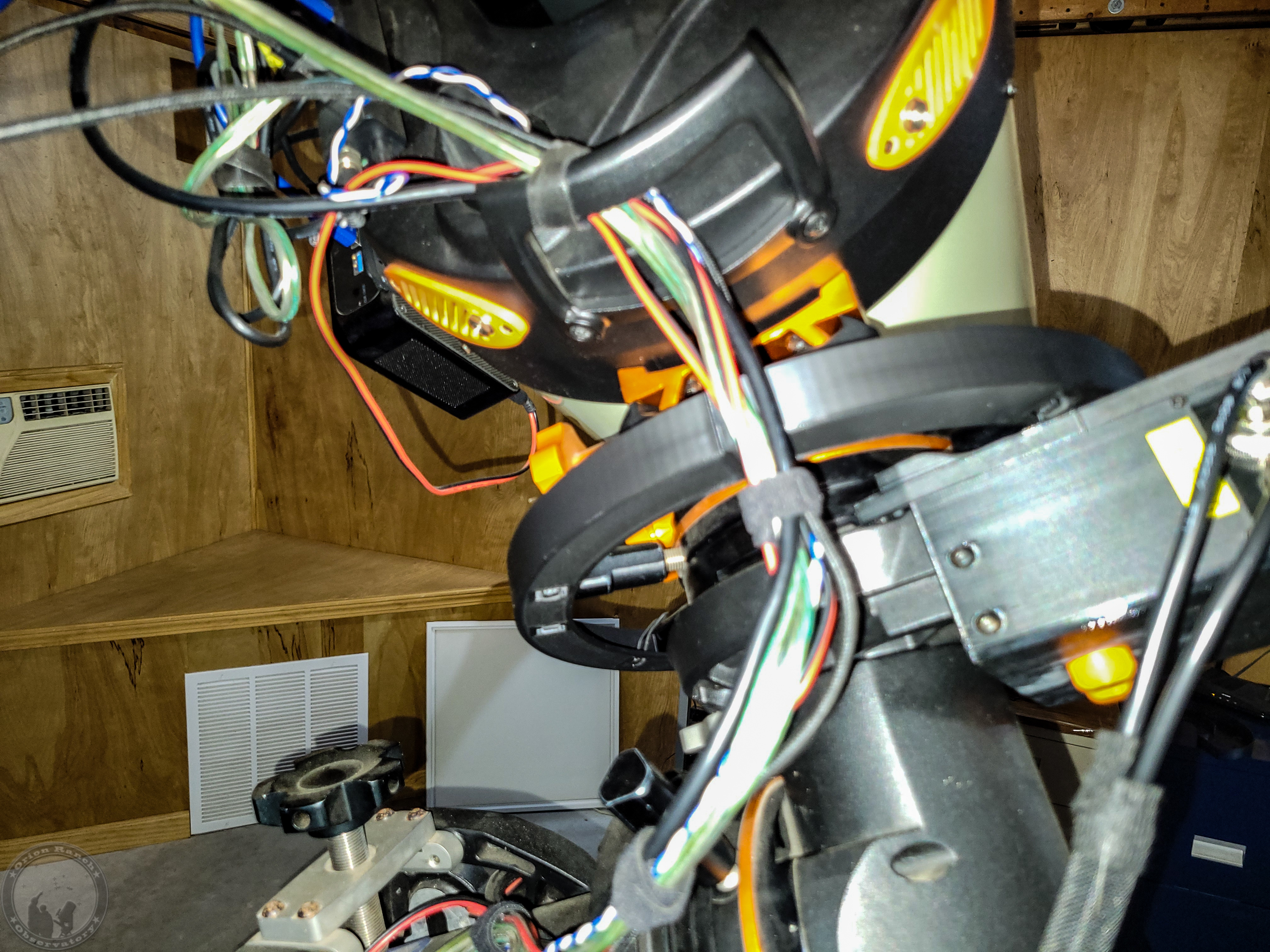 To fix the clearance problems, the inner body was removed, leaving only the outer rim and about an inch of surface material. This allowed it to mount from the bottom and clear the ADM OTA mount knobs on top. The finished design solves the cable snagging problems for RA. The ring is made of two halves that screw together and attach to the knobs with rubber band loops.