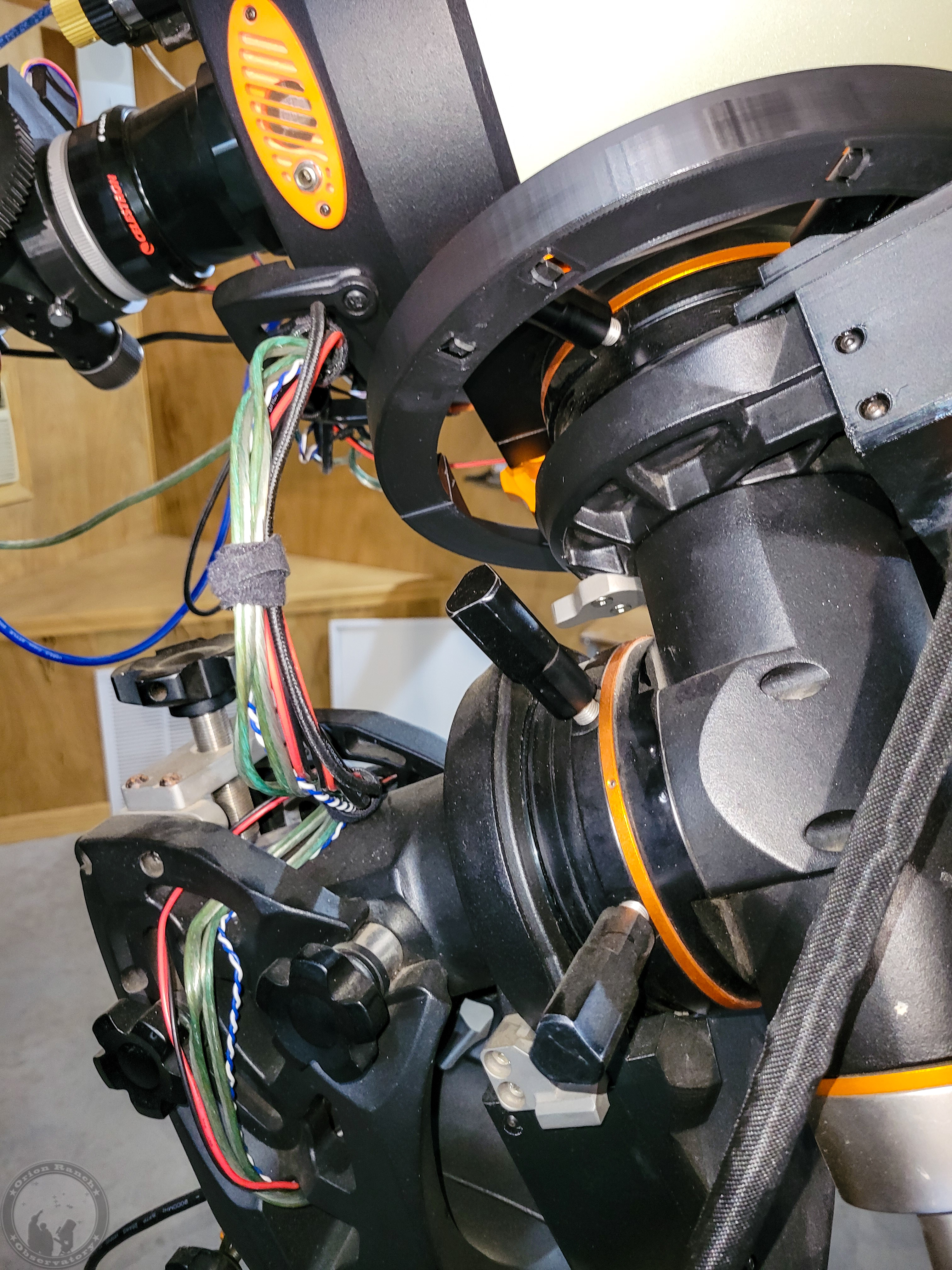 To fix the clearance problems, the inner body was removed, leaving only the outer rim and about an inch of surface material. This allowed it to mount from the bottom and clear the ADM OTA mount knobs on top. The finished design solves the cable snagging problems for RA. The ring is made of two halves that screw together and attach to the knobs with rubber band loops.