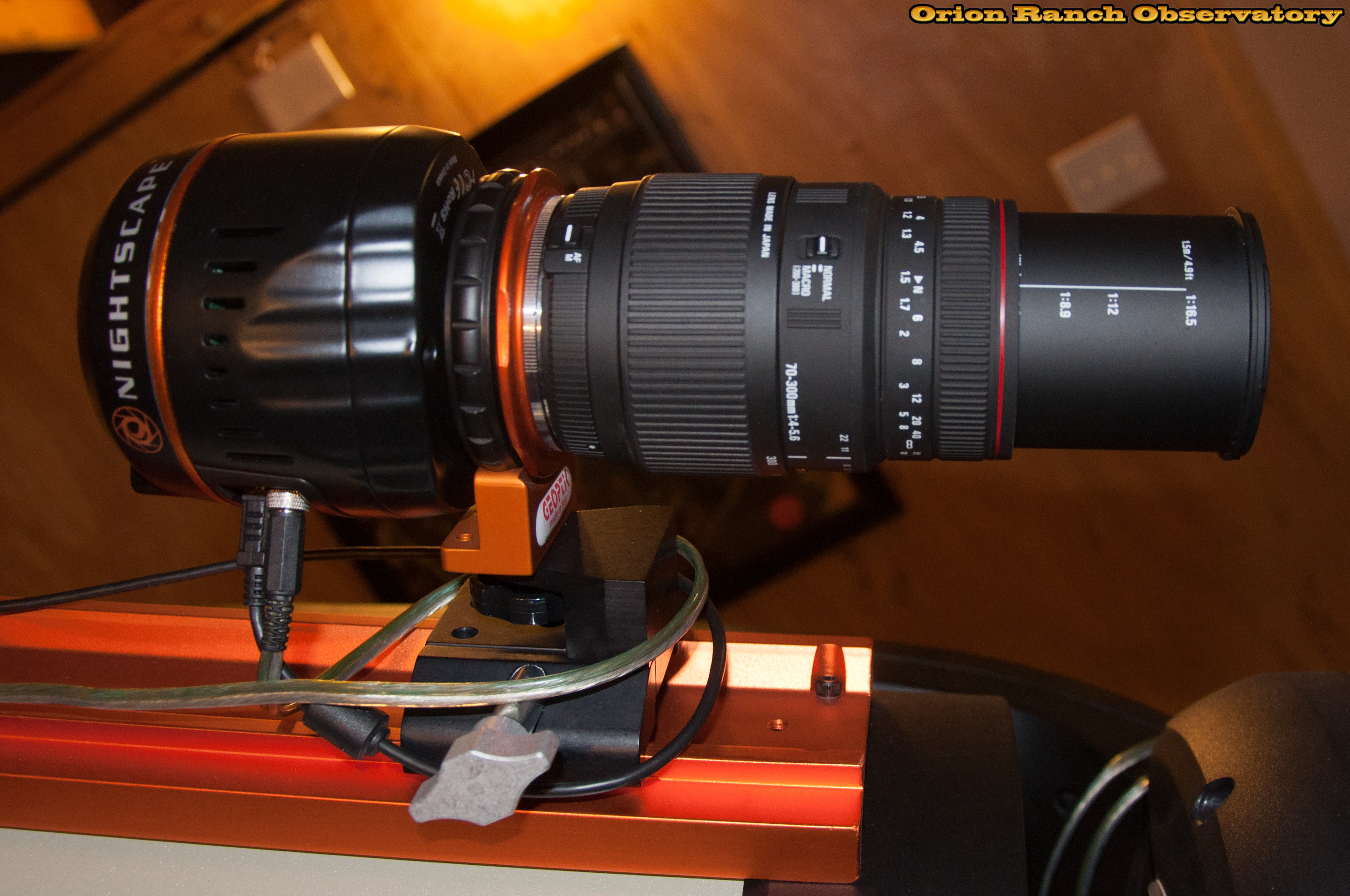 Various views of my Sigma70-300 mm Nikon mount lens and Celestron Nightscape mounted on the adapter with the lens at the 300 mm setting. The nose is getting long, so I better never run past -90 elevation on the fork mount! Unfortunately there's no rotation for the T-ring mount, so the camera ends up at whatever orientation you get.